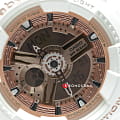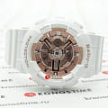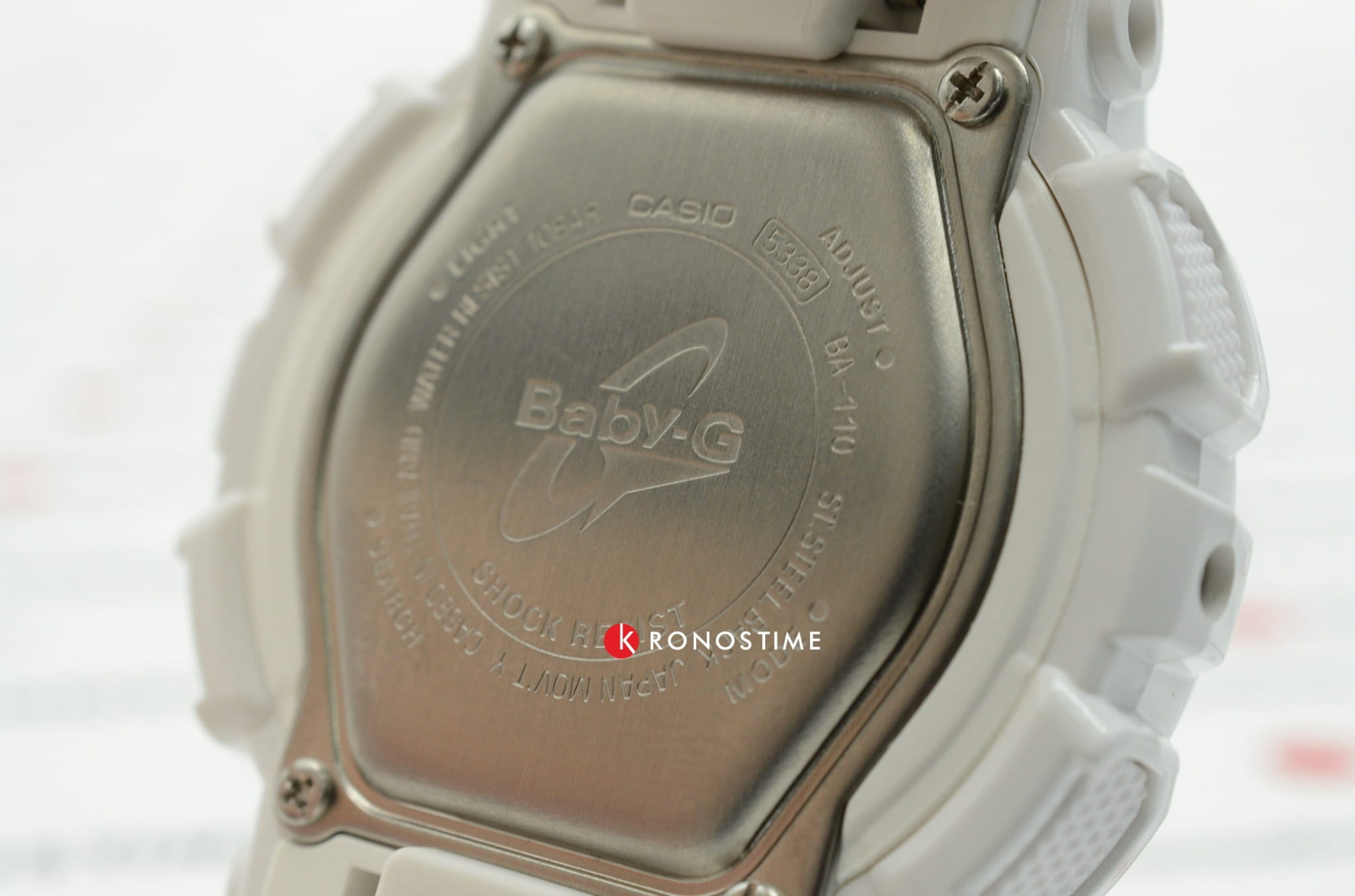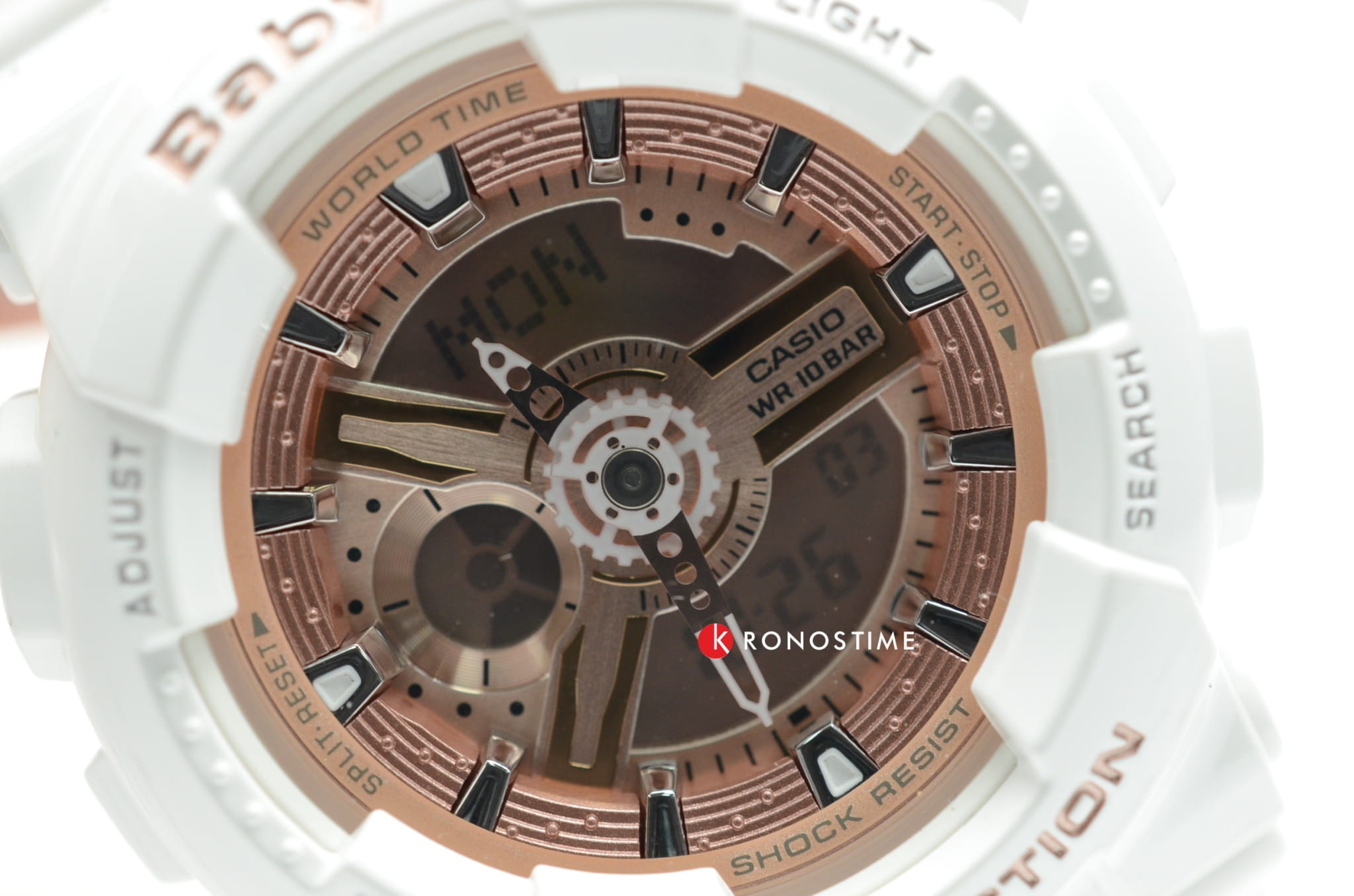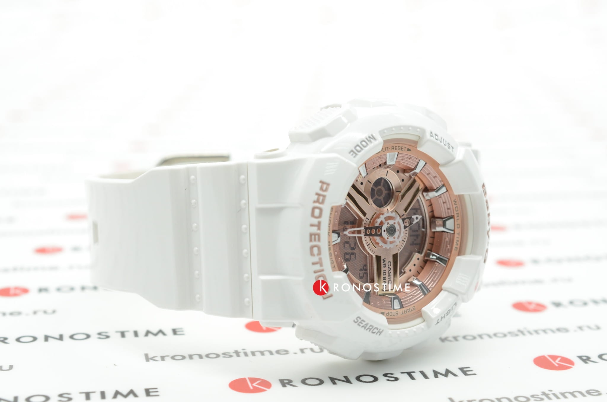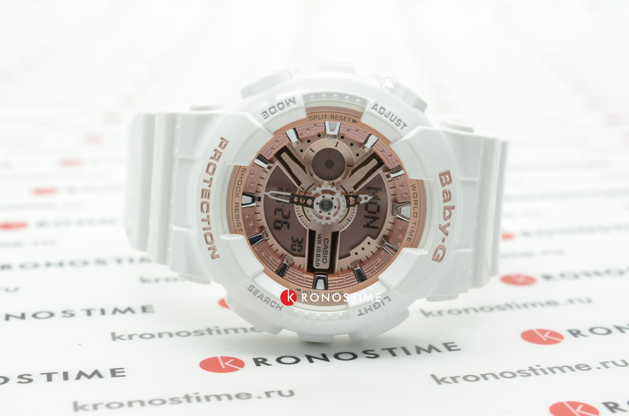 Популярная модель в бело-золотистом исполнении имеет противоударный корпусУдаропрочный корпусМеханизм заключён в корпус, выполненный из современных материалов, устойчивых к ударам, механическим повреждениям и падению с высоты: инновационный пластик, карбон, нержавеющая сталь, титан., выдерживающий механические повреждения и падение с высоты. Он выполнен из полимерного пластика, такой же материал был выбран для гибкого браслета. Кварцевый механизм работает от батарейки, рассчитанной на 2 года службы. Светодиодная подсветкаСветодиодная подсветкаСветодиодная или LED-подсветка обеспечивает появление яркого холодного свечения за счёт LED-элементов - маленьких лампочек. Они потребляют минимальное количество энергии, чаще всего можно встретить 1 светодиод, в нижней части циферблата. дисплея. Минеральное стекло. Секундомер, будильник, мировое времяМировое время Полезное часовое усложнение, отображающее время в основных городах и известных областях по всему миру, оно связано с часовыми поясами, удобно для путешественников и бизнесменов. , автоматический календарь, таймер. Водостойкость 100 метров. Габариты: 43,4 x 46,3 x 15,8 мм.