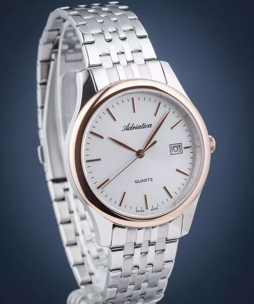 Часы Adriatica A1024.R113Q представляют собой идеальное сочетание элегантности и функциональности, разработанное для современных мужчин. Их стильный циферблат защищен сапфировым стекломСапфировое стеклоПрочный и надёжный материал из кристалла сапфира синтетического происхождения, характеризующийся особой твёрдостью и устойчивостью к царапинам и повреждениям., что придает дополнительную устойчивость к царапинам. Корпус из нержавеющей стали подчеркивает их изысканность и долговечность. Надежный кварцевый механизм с калибром RONDA 515 гарантирует точность времени, а водозащита WR 50 (5 ATM) обеспечивает защиту от воды в различных условиях. Браслет из нержавеющей стали  с раскладной застёжкойРаскладная застёжкаТакой тип застёжки используется только на браслетах из металла. Она никогда не раскрывается полностью, происходит разделение на 2 и более частей. Раскладывающая застёжка снизит вероятность потери часов к минимуму., гармонично дополняет общий дизайн и обеспечивает комфортное ношение на запястье. Часы оснащены функцией отображения даты в окошке в положении 3 часа, что добавляет практичности в повседневной жизни. БезельБезельВнешний ободок, закрепляющий стекло. В спортивных часах так называется поворотное кольцо с делениями на циферблате, выполняет роль таймера – замеряет отрезки времени на шкале. Неподвижный безель – элемент декора. Однонаправленно вращающийся безель на дайверских часах позволяет фиксировать моменты погружения и выныривания на поверхность. с PVD-покрытиемPVDУльтратонкое покрытие наносится в технике вакуумного напыления, сочетает в себе нитрид титана особой прочности со слоем золота или оксида хрома. Несёт в себе декоративную или защитную функцию..
