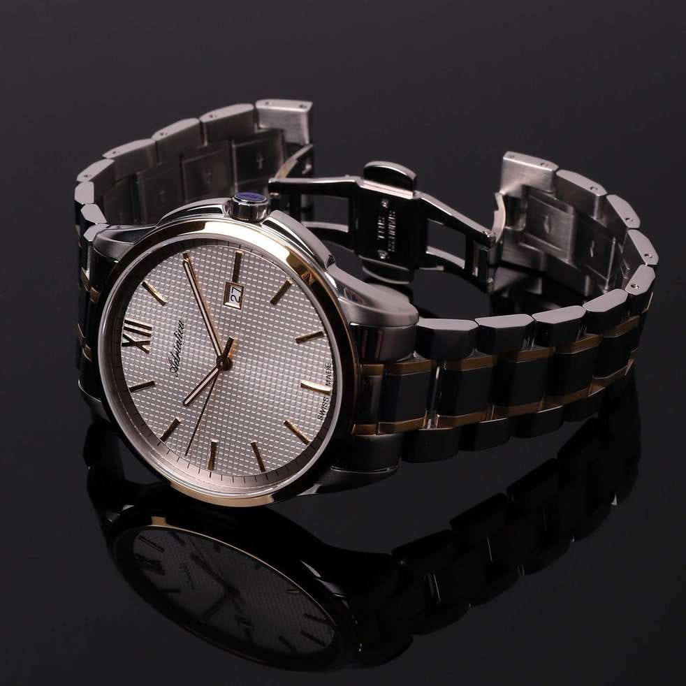 Часы Adriatica A1290.2163Q представляют собой идеальное сочетание элегантности и функциональности, разработанное для современных мужчин. Их стильный циферблат защищен сапфировым стекломСапфировое стеклоПрочный и надёжный материал из кристалла сапфира синтетического происхождения, характеризующийся особой твёрдостью и устойчивостью к царапинам и повреждениям., что придает дополнительную устойчивость к царапинам. Корпус из нержавеющей стали и безельБезельВнешний ободок, закрепляющий стекло. В спортивных часах так называется поворотное кольцо с делениями на циферблате, выполняет роль таймера – замеряет отрезки времени на шкале. Неподвижный безель – элемент декора. Однонаправленно вращающийся безель на дайверских часах позволяет фиксировать моменты погружения и выныривания на поверхность. с PVDPVDУльтратонкое покрытие наносится в технике вакуумного напыления, сочетает в себе нитрид титана особой прочности со слоем золота или оксида хрома. Несёт в себе декоративную или защитную функцию. покрытием, подчеркивает их изысканность и долговечность. Надежный кварцевый механизм с калибром ETA F06 (PreciDrive) гарантирует точность времени, а водозащита WR 50 (5 ATM) обеспечивает защиту от воды в различных условиях. Браслет из нержавеющей стали с частичным PVDPVDУльтратонкое покрытие наносится в технике вакуумного напыления, сочетает в себе нитрид титана особой прочности со слоем золота или оксида хрома. Несёт в себе декоративную или защитную функцию. покрытием и застежкой «бабочка»Застёжка "бабочка"Такой вид застёжки дополняется предохранителями, помогающими избежать случайного раскрытия браслета. Обладают изящным исполнением. гармонично дополняет общий дизайн и обеспечивает комфортное ношение на запястье. Часы оснащены функцией отображения даты в окошке в положении 3 часа, что добавляет практичности в повседневной жизни. Люминесцентное покрытиеЛюминесцентное покрытиеПозволяет считывать показания времени в темноте. Производители наносят на стрелки, часовые индексы, безель или поверхность циферблата светонакопительный состав, дающий холодное свечение. на стрелках и метках обеспечивает отличную видимость в темноте.