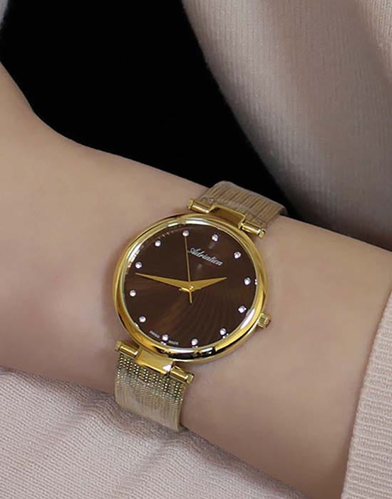 Часы Adriatica A3689.114GQ воплощают в себе утонченную элегантность и безупречное швейцарское качество, создавая идеальный аксессуар для женщин, ценящих стиль и надежность. Изящный корпус и безельБезельВнешний ободок, закрепляющий стекло. В спортивных часах так называется поворотное кольцо с делениями на циферблате, выполняет роль таймера – замеряет отрезки времени на шкале. Неподвижный безель – элемент декора. Однонаправленно вращающийся безель на дайверских часах позволяет фиксировать моменты погружения и выныривания на поверхность. из нержавеющей стали с PVDPVDУльтратонкое покрытие наносится в технике вакуумного напыления, сочетает в себе нитрид титана особой прочности со слоем золота или оксида хрома. Несёт в себе декоративную или защитную функцию. покрытием, что гарантирует долговечность и устойчивость к износу. Минеральное стеклоМинеральное стеклоМинеральное стекло представляет собой искусственно выращенный минерал кварца. Такое стекло отличается особой устойчивостью к повреждениям и царапинам. Уступает по некоторым качествам сапфировому стеклу. надежно защищает циферблат, а точный кварцевый механизм с калибром RONDA 763 обеспечивает стабильность хода. Часы обладают водозащитой WR 30 (3 ATM), что делает их устойчивыми к случайным брызгам и позволяет носить их в любых условиях. Браслет из нержавеющей стали с золотистым PVDPVDУльтратонкое покрытие наносится в технике вакуумного напыления, сочетает в себе нитрид титана особой прочности со слоем золота или оксида хрома. Несёт в себе декоративную или защитную функцию. покрытием из миланского плетения с раскладным замкомРаскладной замокДанный вариант застежки используется только на часах с металлическим браслетом. Отличительная особенность такого крепления в том, что длина браслета становится универсальной и вы можете самостоятельно отрегулировать нужный вам размер – застежка просто двигается по браслету часов., что придает часам современный вид и обеспечивает комфортное прилегание к запястью. Декоративные элементы с фианитами добавляют блеска и утонченности этому аксессуару. С весом всего 45 г, часы почти неощутимы на руке, обеспечивая комфорт на протяжении всего дня.