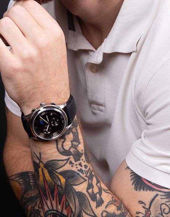 Кварцевые часы работают от батарейки или аккумулятора. Внутри механизма установлен кристалл кварца: под воздействием электричества он колеблется с очень стабильной частотой, а электроника превращает эти колебания в секунды и управляет стрелками. Такие часы ценят за точность и простоту. Средняя погрешность — около ±15 секунд в месяц, поэтому время долго остаётся практически идеальным.