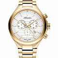 Мужские швейцарские часы-хронографХронографФункция позволяет измерять отрезки времени с особой точностью: часы, минуты, секунды. Верным признаком хронографа является наличие на циферблате 3 дополнительных окошек-счётчиков. Adriatica Passion A8334.1113CH воплощают в себе элегантность и функциональность, их выбирают целеустремленные мужчины, которые знают цену времени. Белый циферблат часов, защищенный сапфировым стекломСапфировое стеклоПрочный и надёжный материал из кристалла сапфира синтетического происхождения, характеризующийся особой твёрдостью и устойчивостью к царапинам и повреждениям., заключен в корпус и безельБезельВнешний ободок, закрепляющий стекло. В спортивных часах так называется поворотное кольцо с делениями на циферблате, выполняет роль таймера – замеряет отрезки времени на шкале. Неподвижный безель – элемент декора. Однонаправленно вращающийся безель на дайверских часах позволяет фиксировать моменты погружения и выныривания на поверхность. из нержавеющей стали с золотистым PVDPVDУльтратонкое покрытие наносится в технике вакуумного напыления, сочетает в себе нитрид титана особой прочности со слоем золота или оксида хрома. Несёт в себе декоративную или защитную функцию. покрытием диаметром 46 мм и толщиной 11 мм. Надежный кварцевый механизм с калибром Ronda 5030 обеспечивает высокую точность, а водозащита 5 ATM делает часы устойчивыми к воздействию воды. Стальной браслет с золотистым PVDPVDУльтратонкое покрытие наносится в технике вакуумного напыления, сочетает в себе нитрид титана особой прочности со слоем золота или оксида хрома. Несёт в себе декоративную или защитную функцию. покрытием и раскладной застёжкойРаскладная застёжкаТакой тип застёжки используется только на браслетах из металла. Она никогда не раскрывается полностью, происходит разделение на 2 и более частей. Раскладывающая застёжка снизит вероятность потери часов к минимуму. обеспечивает комфортное и надежное ношение. Циферблат с метками в виде штрихов имеет 3 дополнительных циферблата, а также окошко даты в положении «4:30» , что добавляет практичности в повседневной жизни.