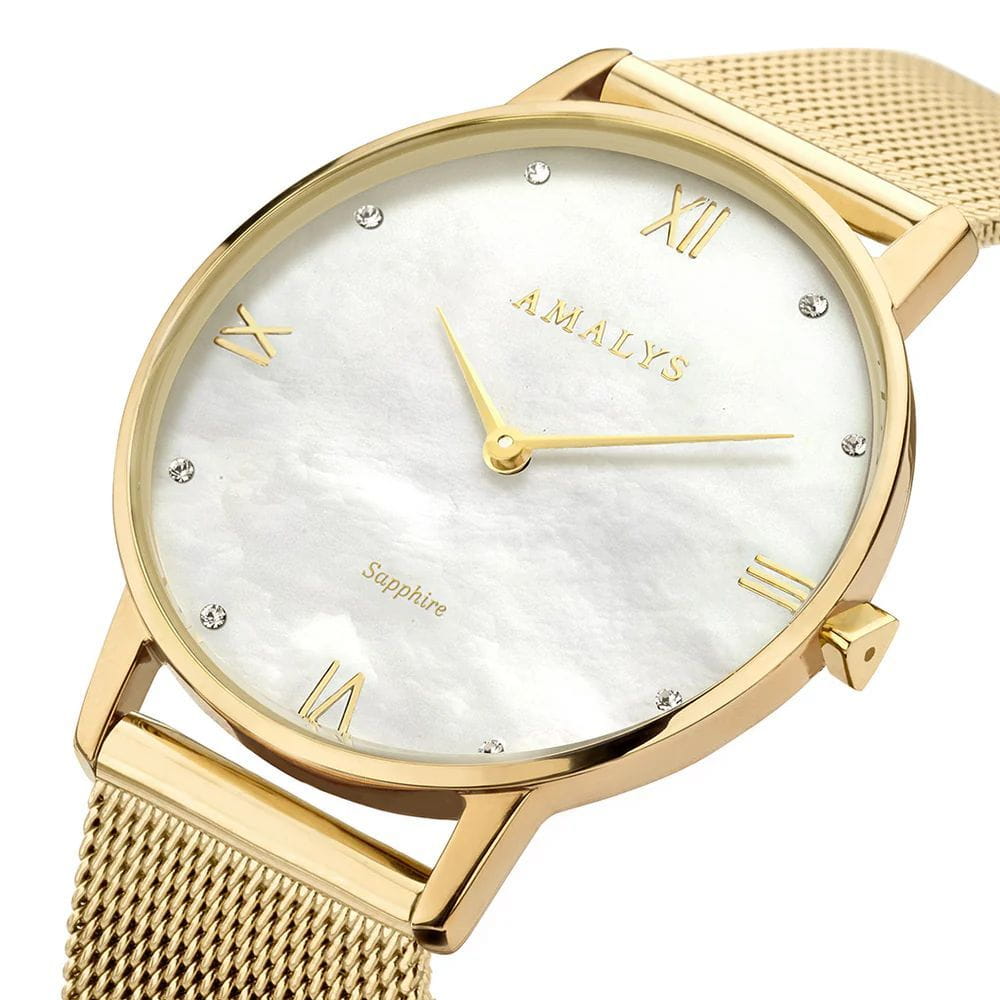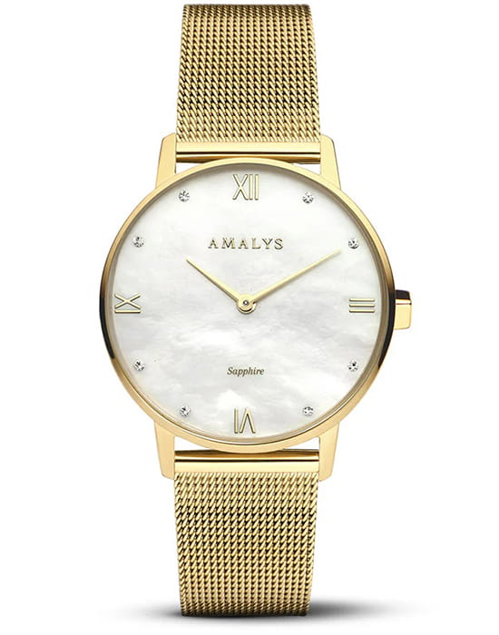 Amalys AMW-183 — женская модель с утончённым классическим дизайном, в которой сочетаются элегантность и практичность. Круглый корпус диаметром 33 мм выполнен из нержавеющей стали с PVD-покрытиемPVDУльтратонкое покрытие наносится в технике вакуумного напыления, сочетает в себе нитрид титана особой прочности со слоем золота или оксида хрома. Несёт в себе декоративную или защитную функцию., гармонирующим с браслетом шириной 16 мм в том же исполнении. Защитную функцию выполняет сапфировое стеклоСапфировое стеклоПрочный и надёжный материал из кристалла сапфира синтетического происхождения, характеризующийся особой твёрдостью и устойчивостью к царапинам и повреждениям., стойкое к царапинам и сохраняющее прозрачность. Механизм — кварцевый, обеспечивающий точность и стабильность хода. Стальной браслет с PVD-покрытиемPVDУльтратонкое покрытие наносится в технике вакуумного напыления, сочетает в себе нитрид титана особой прочности со слоем золота или оксида хрома. Несёт в себе декоративную или защитную функцию. миланского плетения на раскладном замкеРаскладной замокДанный вариант застежки используется только на часах с металлическим браслетом. Отличительная особенность такого крепления в том, что длина браслета становится универсальной и вы можете самостоятельно отрегулировать нужный вам размер – застежка просто двигается по браслету часов. который сочетает надёжность фиксации и удобство повседневного использования. Водозащита 3 ATM защищает часы от случайных брызг и дождя. Циферблат с римскими индексами и изящными стрелками подчёркивает классическую эстетику модели, делая её уместной как в повседневных образах, так и в торжественной обстановке.