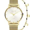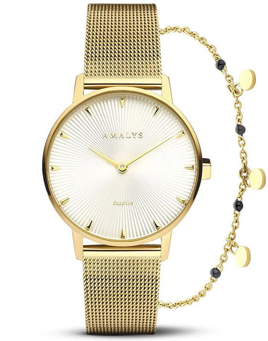 Amalys AMW-193 — женский набор, включающий часы и браслет, выполненный в едином элегантном стиле. Круглый корпус диаметром 33 мм изготовлен из нержавеющей стали с PVDPVDУльтратонкое покрытие наносится в технике вакуумного напыления, сочетает в себе нитрид титана особой прочности со слоем золота или оксида хрома. Несёт в себе декоративную или защитную функцию.-покрытием тёплого золотистого оттенка, что подчёркивает изысканный характер модели. Защитную функцию выполняет сапфировое стеклоСапфировое стеклоПрочный и надёжный материал из кристалла сапфира синтетического происхождения, характеризующийся особой твёрдостью и устойчивостью к царапинам и повреждениям., стойкое к царапинам и сохраняющее прозрачность. Механизм — кварцевый, обеспечивающий точность хода и удобство в использовании. Водозащита 3 ATM защищает от случайных брызг и дождя. Циферблат оформлен в минималистичном стиле с тонкими метками и изящными стрелками, подчёркивающими женственный образ. Стальной браслет миланского плетения с PVDPVDУльтратонкое покрытие наносится в технике вакуумного напыления, сочетает в себе нитрид титана особой прочности со слоем золота или оксида хрома. Несёт в себе декоративную или защитную функцию.-покрытием на раскладном замкеРаскладной замокДанный вариант застежки используется только на часах с металлическим браслетом. Отличительная особенность такого крепления в том, что длина браслета становится универсальной и вы можете самостоятельно отрегулировать нужный вам размер – застежка просто двигается по браслету часов. мягко облегает запястье и гармонично сочетается с корпусом. Дополняющий набор браслет усиливает впечатление цельности и придаёт образу завершённость.