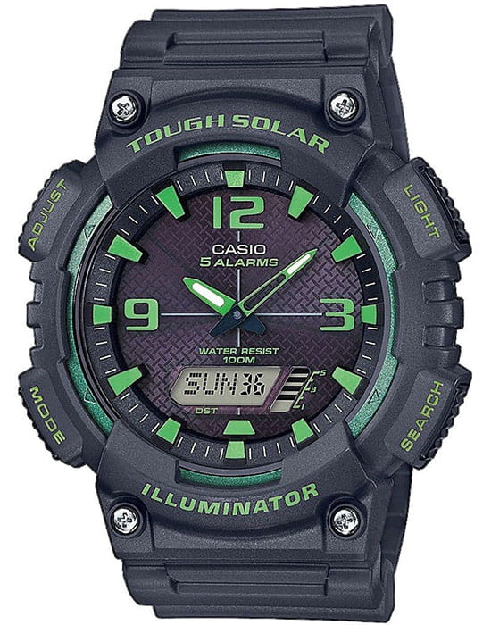 Наручные часы с цифроаналоговой индикацией для активного отдыха. Надежные и недорогие. Прочный пластиковый корпус, водостойкость до 100 метров. Многофункциональный кварцевый механизм, солнечная батарея Tough Solar яркая светодиодная подсветка.