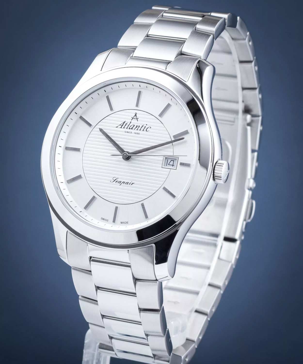 Мужские кварцевые швейцарские часы Atlantic 60335.41.21, механизм с высокой точностью. Циферблат часов с сапфировым стекломСапфировое стеклоПрочный и надёжный материал из кристалла сапфира синтетического происхождения, характеризующийся особой твёрдостью и устойчивостью к царапинам и повреждениям., устойчивым к появлению царапин и обладающее высокой прозрачностью. Класс водозащиты: 30 метров, позволит защитить корпус от случайных брызг или капель дождя. Корпус часов изготовлен из нержавеющей стали. Стальной браслет на раскладной застёжкеРаскладная застёжкаТакой тип застёжки используется только на браслетах из металла. Она никогда не раскрывается полностью, происходит разделение на 2 и более частей. Раскладывающая застёжка снизит вероятность потери часов к минимуму.. Окошко даты находится в положении 3 часа.