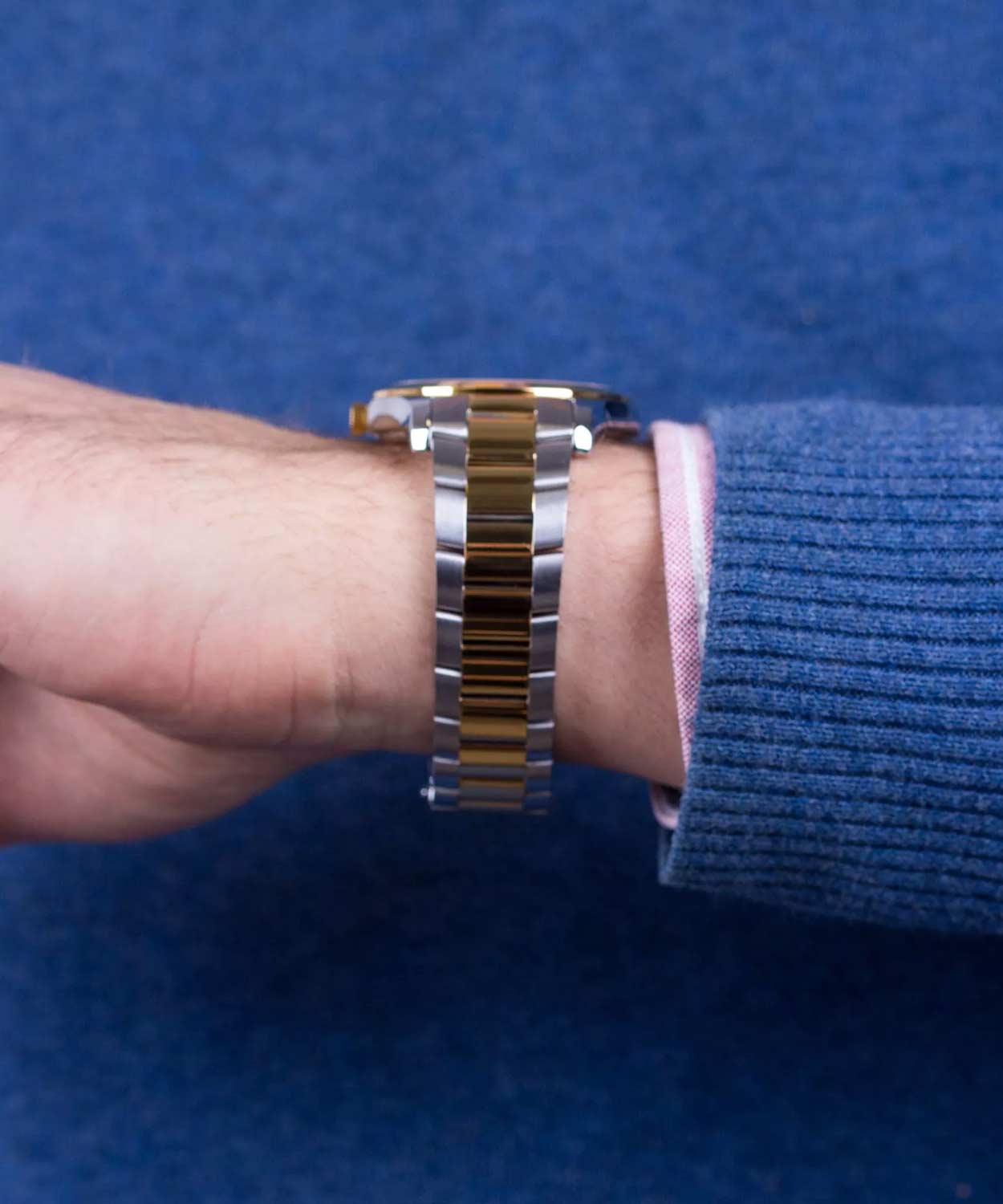 Мужские кварцевые швейцарские часы Atlantic Seapair 60335.43.21G, механизм с высокой точностью. Циферблат часов с сапфировым стекломСапфировое стеклоПрочный и надёжный материал из кристалла сапфира синтетического происхождения, характеризующийся особой твёрдостью и устойчивостью к царапинам и повреждениям., устойчивым к появлению царапин и обладающее высокой прозрачностью. Класс водозащиты: 30 метров, позволит защитить корпус от случайных брызг или капель дождя. Корпус часов изготовлен из нержавеющей стали. Стальной браслет с PVD-покрытиемPVDУльтратонкое покрытие наносится в технике вакуумного напыления, сочетает в себе нитрид титана особой прочности со слоем золота или оксида хрома. Несёт в себе декоративную или защитную функцию. на раскладной застёжкеРаскладная застёжкаТакой тип застёжки используется только на браслетах из металла. Она никогда не раскрывается полностью, происходит разделение на 2 и более частей. Раскладывающая застёжка снизит вероятность потери часов к минимуму.. Окошко даты находится в положении 3 часа. БезельБезельВнешний ободок, закрепляющий стекло. В спортивных часах так называется поворотное кольцо с делениями на циферблате, выполняет роль таймера – замеряет отрезки времени на шкале. Неподвижный безель – элемент декора. Однонаправленно вращающийся безель на дайверских часах позволяет фиксировать моменты погружения и выныривания на поверхность. с PVD-покрытиемPVDУльтратонкое покрытие наносится в технике вакуумного напыления, сочетает в себе нитрид титана особой прочности со слоем золота или оксида хрома. Несёт в себе декоративную или защитную функцию..