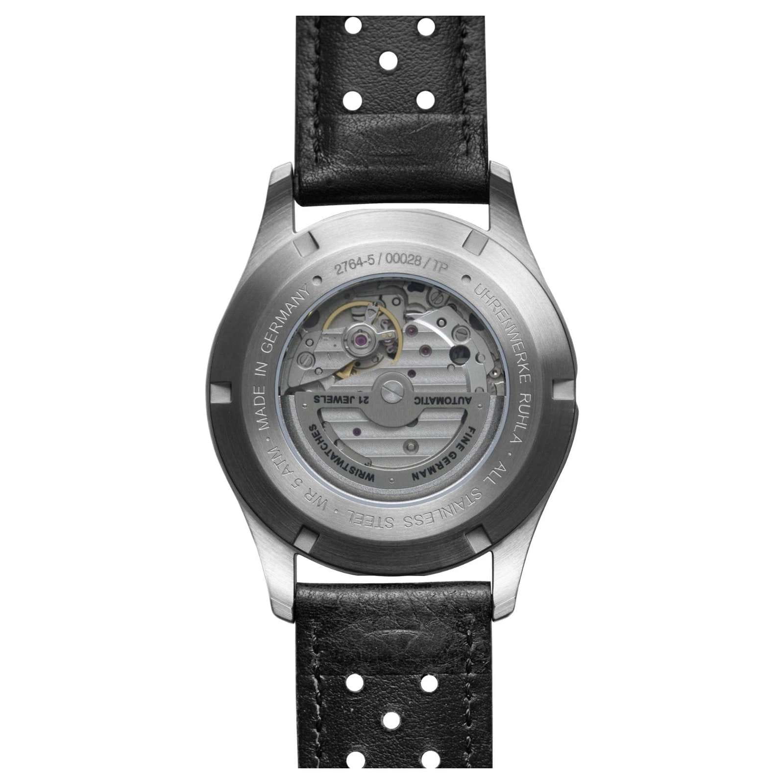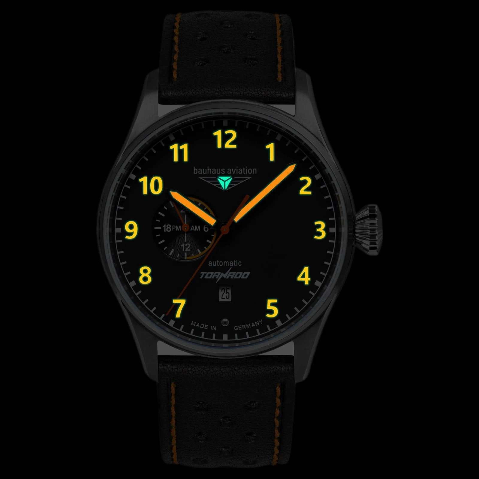 Мужские механические часы с автоподзаводом Bauhaus — это аксессуар в стиле авиационных приборов. Корпус диаметром 42 мм и толщиной 13 мм выполнен из нержавеющей стали. Циферблат чёрного цвета оформлен арабскими цифрами и прямоугольными стрелками. Окошко даты расположено в положении 6 часов, также присутствует дополнительный 24-часовой циферблат. Стрелки и метки с люминесцентным покрытиемЛюминесцентное покрытиеПозволяет считывать показания времени в темноте. Производители наносят на стрелки, часовые индексы, безель или поверхность циферблата светонакопительный состав, дающий холодное свечение., обеспечивающим хорошую читаемость в темноте. Циферблат защищён прочным минеральным стекломМинеральное стеклоМинеральное стекло представляет собой искусственно выращенный минерал кварца. Такое стекло отличается особой устойчивостью к повреждениям и царапинам. Уступает по некоторым качествам сапфировому стеклу. K1. Механизм — автоматический калибр Miyota 8217. Прозрачная задняя крышка позволяет наблюдать за работой механизма. Часы оснащены чёрным кожаным ремешком на классической пряжке. Водонепроницаемость 50 м позволяет использовать часы в повседневных условиях. Идеальный выбор для тех, кто ценит немецкое качество и функциональный дизайн.