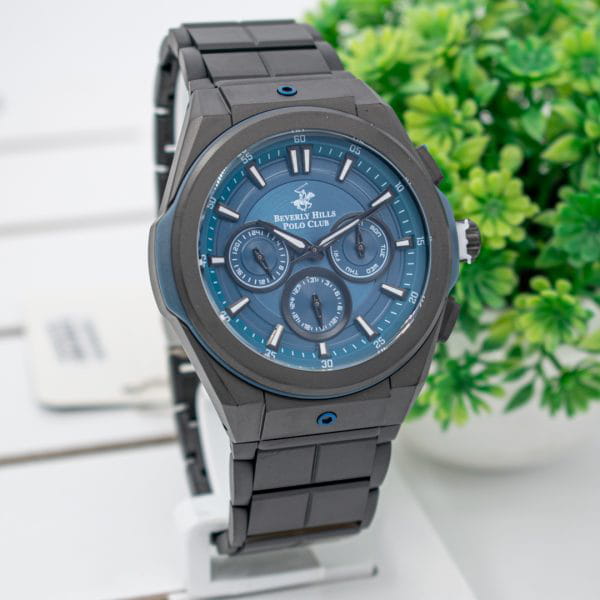 Американские мужские часы-хронографХронографФункция позволяет измерять отрезки времени с особой точностью: часы, минуты, секунды. Верным признаком хронографа является наличие на циферблате 3 дополнительных окошек-счётчиков. c секундомеромСекундомерСекундоме́р — прибор, способный измерять интервалы времени с точностью до долей секунды. Beverly Hills Polo Club BP3406X.690, кварцевый механизм с высокой точностью. Класс водозащиты: 100 метров, позволит защитить корпус от случайных брызг или капель дождя. Корпус часов изготовлен из стали с IP-покрытиемIP-покрытиеМетод ионного напыления. Демонстрирует повышенную устойчивость к истиранию, окислению и химическим веществам. Под воздействием высокого давления и температуры около 1500°C молекулы металла надёжно соединяются с частицами корпуса часов.. Стальной браслет с раскладной застёжкойРаскладная застёжкаТакой тип застёжки используется только на браслетах из металла. Она никогда не раскрывается полностью, происходит разделение на 2 и более частей. Раскладывающая застёжка снизит вероятность потери часов к минимуму. с IP-покрытиемIP-покрытиеМетод ионного напыления. Демонстрирует повышенную устойчивость к истиранию, окислению и химическим веществам. Под воздействием высокого давления и температуры около 1500°C молекулы металла надёжно соединяются с частицами корпуса часов.. Стрелки и метки с люминесцентным покрытиемЛюминесцентное покрытиеПозволяет считывать показания времени в темноте. Производители наносят на стрелки, часовые индексы, безель или поверхность циферблата светонакопительный состав, дающий холодное свечение.. Окошко даты находится в положении 3 часа. БезельБезельВнешний ободок, закрепляющий стекло. В спортивных часах так называется поворотное кольцо с делениями на циферблате, выполняет роль таймера – замеряет отрезки времени на шкале. Неподвижный безель – элемент декора. Однонаправленно вращающийся безель на дайверских часах позволяет фиксировать моменты погружения и выныривания на поверхность. с IP-покрытиемIP-покрытиеМетод ионного напыления. Демонстрирует повышенную устойчивость к истиранию, окислению и химическим веществам. Под воздействием высокого давления и температуры около 1500°C молекулы металла надёжно соединяются с частицами корпуса часов.. Минеральное стеклоМинеральное стеклоМинеральное стекло представляет собой искусственно выращенный минерал кварца. Такое стекло отличается особой устойчивостью к повреждениям и царапинам. Уступает по некоторым качествам сапфировому стеклу. устойчивое к мелким механическим повреждениям.