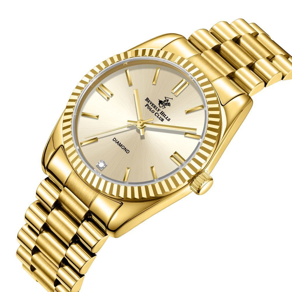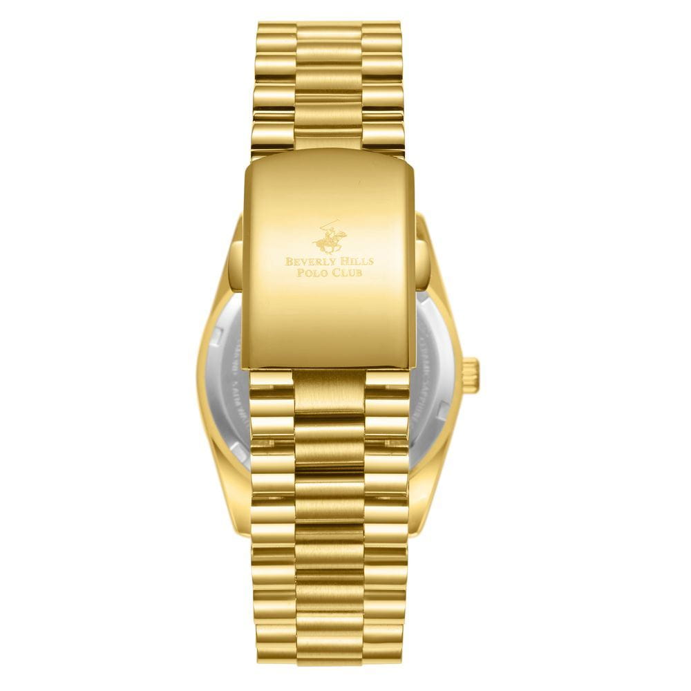Beverly Hills Polo Club BP3172C.110 — женские часы, сочетающие изящество и функциональность в компактном формате. Корпус из суперметалла диаметром 36 мм и браслет украшены IP‑покрытиемIP-покрытиеМетод ионного напыления. Демонстрирует повышенную устойчивость к истиранию, окислению и химическим веществам. Под воздействием высокого давления и температуры около 1500°C молекулы металла надёжно соединяются с частицами корпуса часов. золотого оттенка, создавая благородный дизайн. Стрелки и метки выполнены в золоте, подчёркивая элегантность и визуальную лёгкость. Механизм — точный кварцевый, надёжный и неприхотливый, требующий только замены батареи раз в 1–2 года . Циферблат покрыт прочным минеральным стекломМинеральное стеклоМинеральное стекло представляет собой искусственно выращенный минерал кварца. Такое стекло отличается особой устойчивостью к повреждениям и царапинам. Уступает по некоторым качествам сапфировому стеклу., устойчивым к царапинам и сохраняющим безупречный внешний вид . Браслет на удобной раскладной застёжкеРаскладная застёжкаТакой тип застёжки используется только на браслетах из металла. Она никогда не раскрывается полностью, происходит разделение на 2 и более частей. Раскладывающая застёжка снизит вероятность потери часов к минимуму., обеспечивая плавное и надёжное прилегание. Водозащита на уровне 3 ATM (≈30 м) защищает от брызг и случайных осадков . Beverly Hills Polo Club — утончённый аксессуар для женщин, ценящих стиль, надёжность и изысканные детали, где каждая функция подчёркнута строгой, но изящной эстетикой.