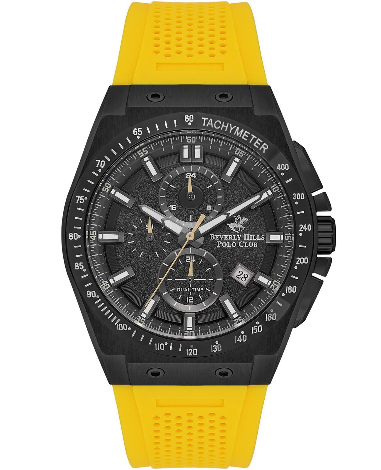 Американские мужские часы-хронографХронографФункция позволяет измерять отрезки времени с особой точностью: часы, минуты, секунды. Верным признаком хронографа является наличие на циферблате 3 дополнительных окошек-счётчиков. Beverly Hills Polo Club BP3541X.654, кварцевый механизм с высокой точностью. Класс водозащиты: 50 метров, позволит защитить корпус от случайных брызг или капель дождя. Корпус часов изготовлен из нержавеющей стали с IP-покрытиемIP-покрытиеМетод ионного напыления. Демонстрирует повышенную устойчивость к истиранию, окислению и химическим веществам. Под воздействием высокого давления и температуры около 1500°C молекулы металла надёжно соединяются с частицами корпуса часов.. Модель оснащена тахиметромТахиметрРазмеченная шкала, располагается на ободке или безеле часов. Тахиметр позволяет рассчитать скорость на определённом участке пути, расстояние измеряется в километрах или милях., на циферблате расположено окошко даты в положении между 4 и 5 часов. Каучуковый ремешок на стандартной застёжке. На отдельных циферблатах отображен 24-х часовой формат времени, и второй часовой поясВторой часовой поясФункция, позволяющая отображать время двух часовых поясов одновременно.. Стрелки и метки с люминесцентным покрытиемЛюминесцентное покрытиеПозволяет считывать показания времени в темноте. Производители наносят на стрелки, часовые индексы, безель или поверхность циферблата светонакопительный состав, дающий холодное свечение..