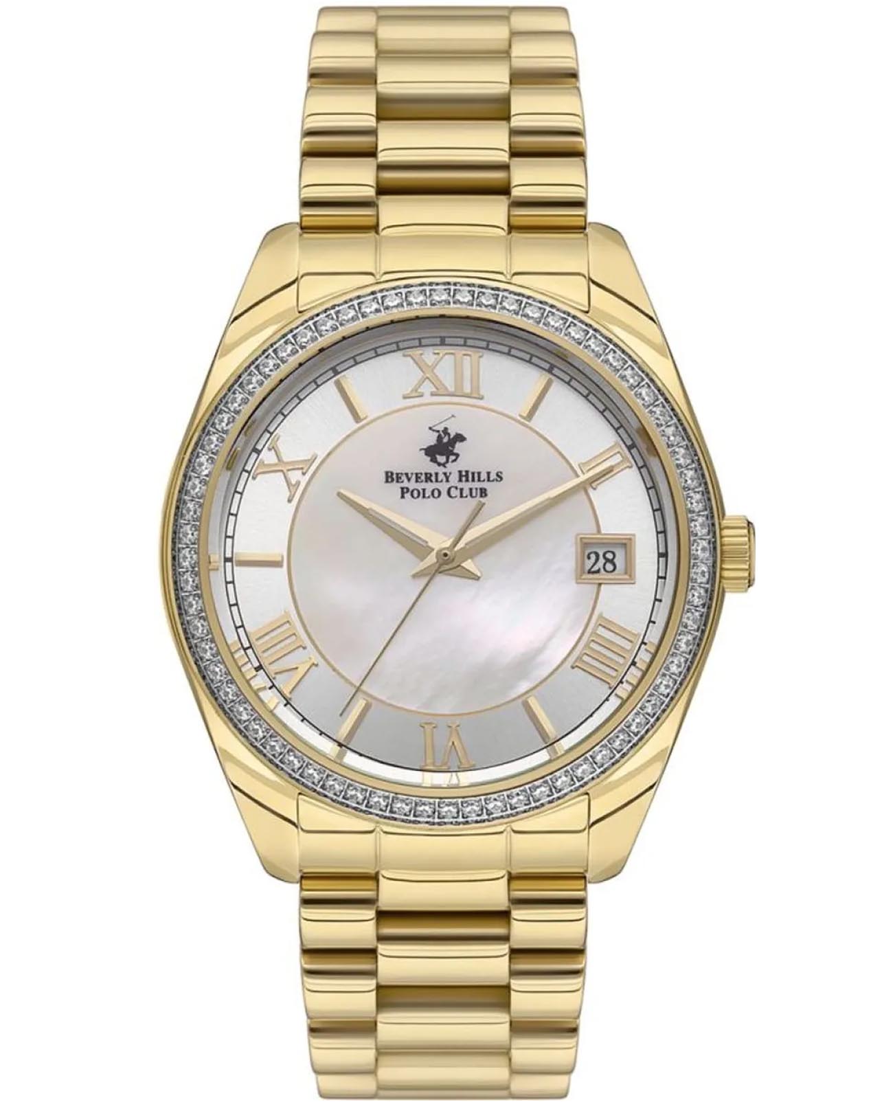 Женские часы Beverly Hills Polo BP3592C.120 с надёжным кварцевым механизмом. Минеральное стеклоМинеральное стеклоМинеральное стекло представляет собой искусственно выращенный минерал кварца. Такое стекло отличается особой устойчивостью к повреждениям и царапинам. Уступает по некоторым качествам сапфировому стеклу. устойчивое к появлению царапин, обладающее высокой прозрачностью. Класс водозащиты: 30 метров, позволит защитить корпус от случайных брызг или капель дождя. Корпус и браслет часов изготовлены из стали с IP-покрытиемIP-покрытиеМетод ионного напыления. Демонстрирует повышенную устойчивость к истиранию, окислению и химическим веществам. Под воздействием высокого давления и температуры около 1500°C молекулы металла надёжно соединяются с частицами корпуса часов.. Стальной браслет на раскладной застёжкеРаскладная застёжкаТакой тип застёжки используется только на браслетах из металла. Она никогда не раскрывается полностью, происходит разделение на 2 и более частей. Раскладывающая застёжка снизит вероятность потери часов к минимуму.. БезельБезельВнешний ободок, закрепляющий стекло. В спортивных часах так называется поворотное кольцо с делениями на циферблате, выполняет роль таймера – замеряет отрезки времени на шкале. Неподвижный безель – элемент декора. Однонаправленно вращающийся безель на дайверских часах позволяет фиксировать моменты погружения и выныривания на поверхность. инкрустирован кристаллами. Стрелки и метки с люминесцентным покрытиемЛюминесцентное покрытиеПозволяет считывать показания времени в темноте. Производители наносят на стрелки, часовые индексы, безель или поверхность циферблата светонакопительный состав, дающий холодное свечение..