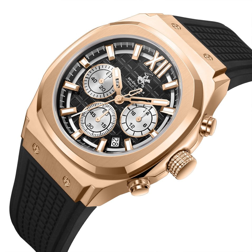 Американские мужские часы Beverly Hills Polo Club BP3785X.451 - это стильный мужской хронографХронографФункция позволяет измерять отрезки времени с особой точностью: часы, минуты, секунды. Верным признаком хронографа является наличие на циферблате 3 дополнительных окошек-счётчиков., который сочетает элегантный дизайн и практичность. Корпус выполнен из нержавеющей стали с IP-покрытиемIP-покрытиеМетод ионного напыления. Демонстрирует повышенную устойчивость к истиранию, окислению и химическим веществам. Под воздействием высокого давления и температуры около 1500°C молекулы металла надёжно соединяются с частицами корпуса часов. цвета розового золота, диаметром 45,5 мм. Надежное минеральное стеклоМинеральное стеклоМинеральное стекло представляет собой искусственно выращенный минерал кварца. Такое стекло отличается особой устойчивостью к повреждениям и царапинам. Уступает по некоторым качествам сапфировому стеклу. с сапфировым покрытием защищает циферблат от царапин и обеспечивает долговечность. Модель оснащена кварцевым механизмом, обеспечивающим высокую точность хода. Каучуковый ремешок на стандартной застежке обеспечивает комфортное ношение. Функциональность модели расширена за счёт индикации даты и дополнительным 24-х часовым индикатором. Стрелки и метки с люминесцентным покрытиемЛюминесцентное покрытиеПозволяет считывать показания времени в темноте. Производители наносят на стрелки, часовые индексы, безель или поверхность циферблата светонакопительный состав, дающий холодное свечение. позволяют легко считывать время даже в условиях недостаточного освещения. Водозащита 50 метров позволит защитить корпус от случайных брызг или капель дождя. Эта модель – отличный выбор для тех, кто ищет сочетание стиля, качества и функциональности. Часы станут не только полезным аксессуаром, но и выразительным элементом вашего имиджа.