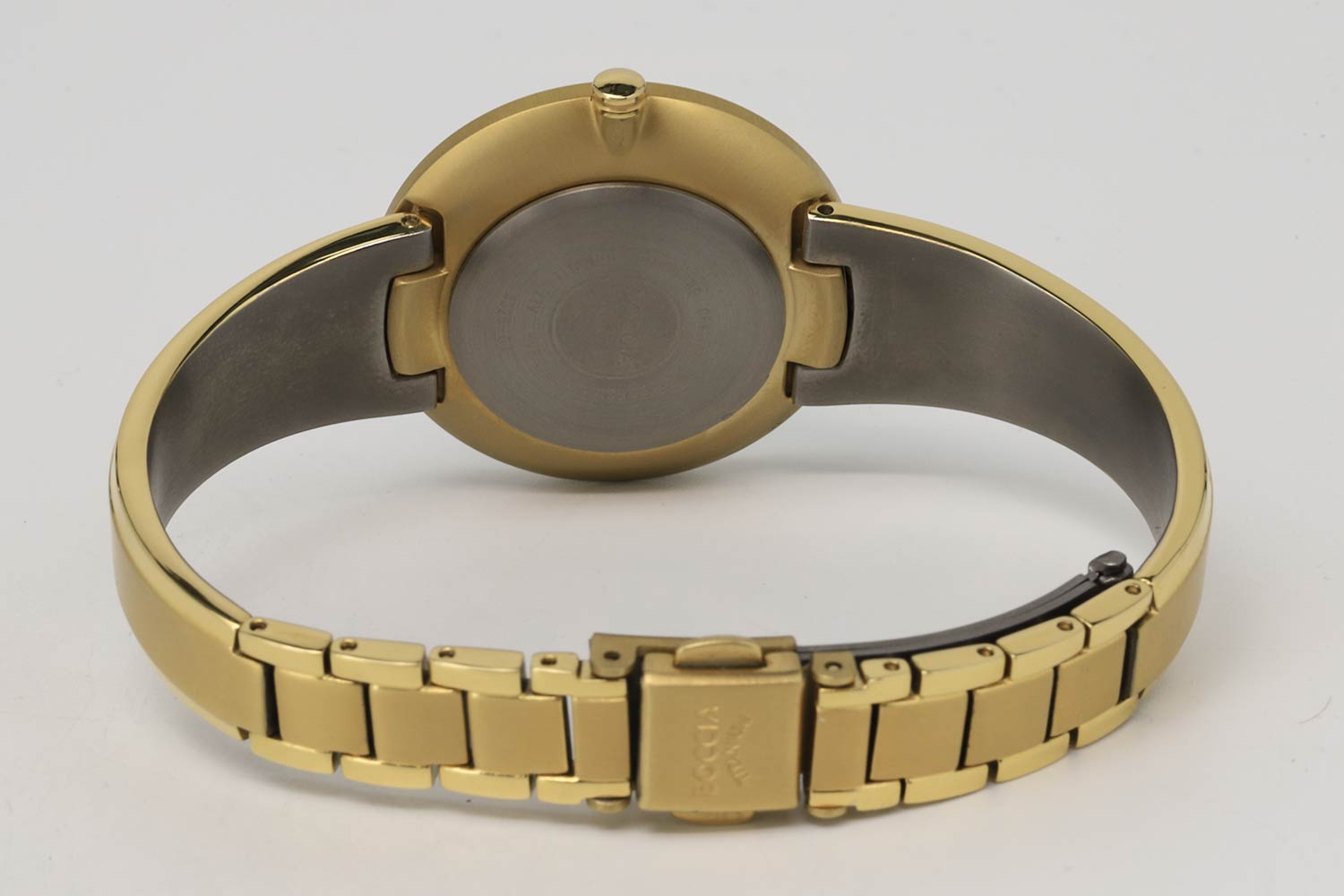 Женские немецкие наручные часы Boccia Titanium 3325-03 с надёжным кварцевым механизмом. Корпус и браслет часов изготовлены из титана с PVD-покрытиемPVDУльтратонкое покрытие наносится в технике вакуумного напыления, сочетает в себе нитрид титана особой прочности со слоем золота или оксида хрома. Несёт в себе декоративную или защитную функцию.. Сапфировое стеклоСапфировое стеклоПрочный и надёжный материал из кристалла сапфира синтетического происхождения, характеризующийся особой твёрдостью и устойчивостью к царапинам и повреждениям. устойчивое к мелким механическим повреждениям. Класс водозащиты: 30 метров, позволит защитить корпус от случайных брызг или капель дождя. Титановый браслет на раскладной застёжкеРаскладная застёжкаТакой тип застёжки используется только на браслетах из металла. Она никогда не раскрывается полностью, происходит разделение на 2 и более частей. Раскладывающая застёжка снизит вероятность потери часов к минимуму..