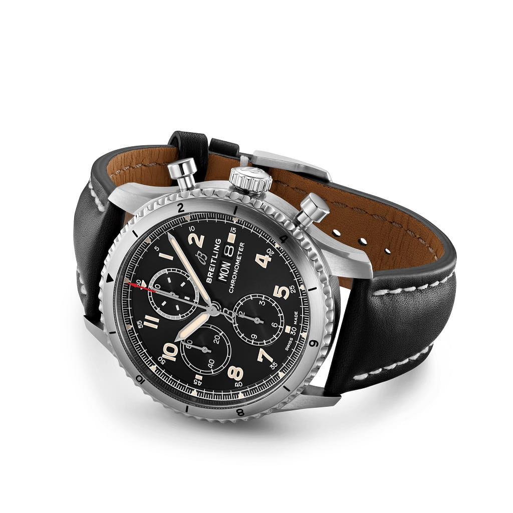 Модель Aviator 8 Chronograph 43 A13316101B1X2 оснащена 30-минутным и 12-часовым счетчиками, расположенными в положении «12» и «6 часов», а также малой секундной стрелкой в положении «9 часов». Уровень точности достигает 1/4 секунды. «Сердце» данной модели – калибр Breitling Caliber 13, подтвержденный сертификатом Швейцарского института официального тестирования хронометров (COSC). Он приводится в действие однонаправленным ротором с шарикоподшипниками и обладает запасом хода более 42 часов. Сплошная крышка корпуса диаметром 43 мм крепится на винтах.
