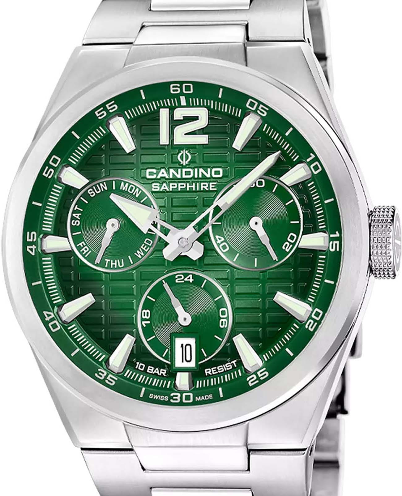 Мужские кварцевые часы Candino — это сочетание классического дизайна, надёжности и швейцарского качества. Корпус диаметром 43 мм и толщиной 11,5 мм выполнен из нержавеющей стали. Циферблат зелёного цвета оформлен индексами в виде штрихов и стрелками. Указатели дня недели и даты расположены в центре циферблата. Стрелки и метки с люминесцентным покрытиемЛюминесцентное покрытиеПозволяет считывать показания времени в темноте. Производители наносят на стрелки, часовые индексы, безель или поверхность циферблата светонакопительный состав, дающий холодное свечение., обеспечивающим хорошую читаемость в темноте. Циферблат защищён сапфировым стекломСапфировое стеклоПрочный и надёжный материал из кристалла сапфира синтетического происхождения, характеризующийся особой твёрдостью и устойчивостью к царапинам и повреждениям., устойчивым к царапинам. Механизм — кварцевый произведённый в Швейцарии. Часы оснащены стальным браслетом с раскладной застёжкойРаскладная застёжкаТакой тип застёжки используется только на браслетах из металла. Она никогда не раскрывается полностью, происходит разделение на 2 и более частей. Раскладывающая застёжка снизит вероятность потери часов к минимуму.. Водонепроницаемость 100 м позволяет использовать часы для плавания и повседневного ношения. Гарантия — 2 года. Идеальный выбор для тех, кто ценит стиль, функциональность и точность.