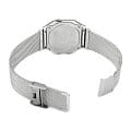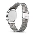 Серебристая цветовая гамма подойдёт к любой одежде, предоставляя простор для экспериментов. Цифровой дисплей оснащён функцией подсветки, облегчающей считывание информации в темноте. Среди дополнительных возможностей числятся будильник, календарь, секундомер. Ударопрочный корпус сделан из полимерного пластика. Стильный браслет миланского плетения. Минеральное стекло отличается устойчивостью к появлению царапин. Габариты: 38,6 x 36,3 x 9,6 мм.