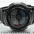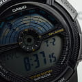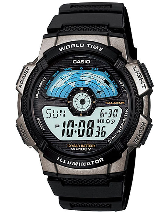Японские мужские наручные часы AE-1100W-1AER с функцией мирового времени, секундомера, таймера, будильника. Оснащены подсветкой. Корпус - Пластиковый; Стекло - Пластик; Водозащита - 100 м. (WR 100); Материал ремешка - Пластиковый; Цвет ремешка - Черный; Цвет циферблата - Lcd.