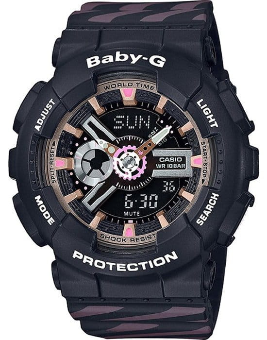 Привлекательная модель относится к специальной линейке Baby-G «Chance», созданной под руководством миланского дизайнерского бюро Punto it design. Черный аксессуар с линеарным принтом на полимерном ремешке наделён ударопрочным корпусомУдаропрочный корпусМеханизм заключён в корпус, выполненный из современных материалов, устойчивых к ударам, механическим повреждениям и падению с высоты: инновационный пластик, карбон, нержавеющая сталь, титан. из пластика, выдерживающего удары и повреждения. Японский кварцевый механизм. Срок службы батарейки - 2 года. Минеральное стекло. Светодиодная подсветкаСветодиодная подсветкаСветодиодная или LED-подсветка обеспечивает появление яркого холодного свечения за счёт LED-элементов - маленьких лампочек. Они потребляют минимальное количество энергии, чаще всего можно встретить 1 светодиод, в нижней части циферблата. циферблата. Включение и отключение звука кнопок. Водонепроницаемость до 10 бар. Функция мирового времениМировое время Полезное часовое усложнение, отображающее время в основных городах и известных областях по всему миру, оно связано с часовыми поясами, удобно для путешественников и бизнесменов. , 5 будильников, секундомер, таймер, хронографХронографФункция позволяет измерять отрезки времени с особой точностью: часы, минуты, секунды. Верным признаком хронографа является наличие на циферблате 3 дополнительных окошек-счётчиков., календарь. Габариты: 46,3 x 43,4 x 15,8 мм.
