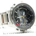 Достаточно внушительный чёрный циферблат имеет золотистые акценты, оригинально смотрится необычное расположение счётчиков. Многофункциональная модель пригодится на любой случай жизни, ведь она оснащена Bluetooth 4.0BluetoothСовременная технология, позволяющая синхронизировать часы с телефоном и переносить данные. Часы с Bluetooth расширяют возможности вашего смартфона и делают его использование ещё более удобным., хронографомХронографФункция позволяет измерять отрезки времени с особой точностью: часы, минуты, секунды. Верным признаком хронографа является наличие на циферблате 3 дополнительных окошек-счётчиков., секундомером, тахиметромТахиметрРазмеченная шкала, располагается на ободке или безеле часов. Тахиметр позволяет рассчитать скорость на определённом участке пути, расстояние измеряется в километрах или милях., таймером, будильником, календарём, есть мировое времяМировое время Полезное часовое усложнение, отображающее время в основных городах и известных областях по всему миру, оно связано с часовыми поясами, удобно для путешественников и бизнесменов. и функция поиска телефона. Питание поступает от солнечной энергии - . Водонепроницаемость до 10 бар. Корпус, браслет, безельБезельВнешний ободок, закрепляющий стекло. В спортивных часах так называется поворотное кольцо с делениями на циферблате, выполняет роль таймера – замеряет отрезки времени на шкале. Неподвижный безель – элемент декора. Однонаправленно вращающийся безель на дайверских часах позволяет фиксировать моменты погружения и выныривания на поверхность. из хирургической стали 316L. Минеральное стекло. Двойная светодиодная подсветкаСветодиодная подсветкаСветодиодная или LED-подсветка обеспечивает появление яркого холодного свечения за счёт LED-элементов - маленьких лампочек. Они потребляют минимальное количество энергии, чаще всего можно встретить 1 светодиод, в нижней части циферблата.. Габариты: 51,5 x 48 x 13,9 мм.