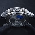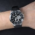 Аксессуар подарит вам истинное удовольствие не только при использовании, но и порадует оригинальным оформлением. Привлекательный узор, необычное расположение миниатюрных окошек-счётчиков, броские элементы - всё это являет тщательно проработанный дизайн. Чёрный безельБезельВнешний ободок, закрепляющий стекло. В спортивных часах так называется поворотное кольцо с делениями на циферблате, выполняет роль таймера – замеряет отрезки времени на шкале. Неподвижный безель – элемент декора. Однонаправленно вращающийся безель на дайверских часах позволяет фиксировать моменты погружения и выныривания на поверхность. имеет износоустойчивое PVD-покрытиеPVDУльтратонкое покрытие наносится в технике вакуумного напыления, сочетает в себе нитрид титана особой прочности со слоем золота или оксида хрома. Несёт в себе декоративную или защитную функцию.. Завинчивающаяся задняя крышка. Люминесцентное светонакопительное покрытиеЛюминесцентное покрытиеПозволяет считывать показания времени в темноте. Производители наносят на стрелки, часовые индексы, безель или поверхность циферблата светонакопительный состав, дающий холодное свечение. стрелок и меток. Минеральное стекло. Каучуковый гибкий ремешок. ХронографХронографФункция позволяет измерять отрезки времени с особой точностью: часы, минуты, секунды. Верным признаком хронографа является наличие на циферблате 3 дополнительных окошек-счётчиков., секундомер, отображение текущего числа. Габариты: 43,8 x 49,1 x 10,8 мм.