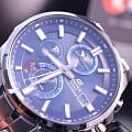 Стильные наручные кварцевые мужские часы на солнечной батарейке. Индикатор уровня заряда аккумулятора (Этот индикатор отображает текущий уровень заряда аккумулятора). Круглый корпус и браслет часов выполнены из высокопрочной стали. Синий фон циферблата с контрастными элементами дизайна. Водонепроницаемость часов составляет 10 ATM. Сапфировое стекло, устойчивое к появлению царапин. Часы оснащены хронографом. Модный и современный аксессуар.