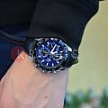 Стильные японские наручные кварцевые мужские часы. Круглый корпус  часов выполнен из стали с антикоррозийными свойствами. Синий циферблат, с карбоновым эффектом, с контрастными элементами дизайна. Водонепроницаемость 10 ATM. Минеральное стекло, устойчивое к появлению царапин. Ремешок из натуральной кожи синего цвета. Часы оснащены функцией хронографа.