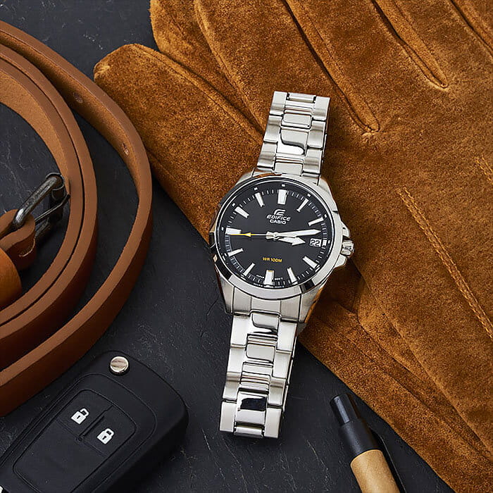 Брендовый аксессуар из серии EFV-100 будет отлично смотреться как с деловым костюмом, так и с повседневной одеждой. Стальной браслет на раскладной застёжкеРаскладная застёжкаТакой тип застёжки используется только на браслетах из металла. Она никогда не раскрывается полностью, происходит разделение на 2 и более частей. Раскладывающая застёжка снизит вероятность потери часов к минимуму.. Чёрный циферблат дополнен контрастными стрелками и метками, секундная стрелка облегчает читаемость показателей благодаря жёлтому наконечнику. Минималистичные часы выполнены из нержавеющей стали 316L, материал отличается долговечностью и устойчивостью к царапинам. Кварцевый механизм работает от батарейки, срок её службы составит 3 года. Подсветка NeobriteПодсветка NeobriteИспользование светонакопительных составов на основе сульфида цинка или алюмината стронция, яркий свет можно наблюдать на протяжении 6-10 часов после «зарядки» часов около источника света. продолжает светиться в темноте даже после непродолжительного пребывания на свету. Водостойкость 10 бар. Минеральное стеклоМинеральное стеклоМинеральное стекло представляет собой искусственно выращенный минерал кварца. Такое стекло отличается особой устойчивостью к повреждениям и царапинам. Уступает по некоторым качествам сапфировому стеклу.. Прямоугольная апертура даты. Габариты: 48 x 42 x 10,9 мм.