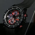 Циферблат выполнен в характерных тонах команды- ярко красном и черном, а покрытие у него карбоновое.