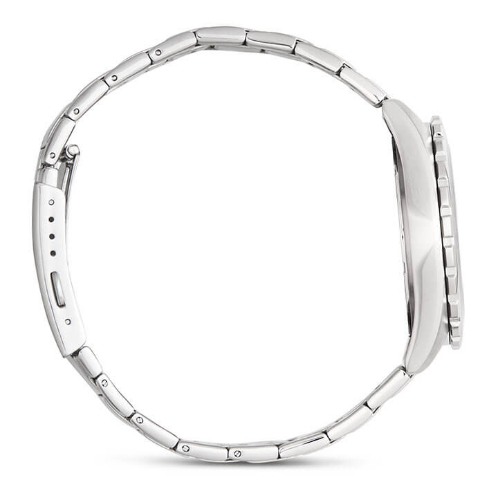 Светло-серебристая модель наделена элементами дайверского дизайна, повторяя внешний облик механических часов для дайвинга 1950-х годов, в глаза бросается массивный однонаправленно вращающийся безельБезельВнешний ободок, закрепляющий стекло. В спортивных часах так называется поворотное кольцо с делениями на циферблате, выполняет роль таймера – замеряет отрезки времени на шкале. Неподвижный безель – элемент декора. Однонаправленно вращающийся безель на дайверских часах позволяет фиксировать моменты погружения и выныривания на поверхность., крупные стрелки и часовые индексы. Секундная стрелка дополнена голубым наконечником, что обеспечивает превосходную читаемость показаний с циферблата. Кварцевый японский механизм с точностью хода часов +/- 20 секунд в месяц. Батарейка рассчитана на 3 года работы. Люминесцентная подсветка NeobriteПодсветка NeobriteИспользование светонакопительных составов на основе сульфида цинка или алюмината стронция, яркий свет можно наблюдать на протяжении 6-10 часов после «зарядки» часов около источника света.. Водонепроницаемость при давлении до 10 бар. Ударопрочный корпусУдаропрочный корпусМеханизм заключён в корпус, выполненный из современных материалов, устойчивых к ударам, механическим повреждениям и падению с высоты: инновационный пластик, карбон, нержавеющая сталь, титан. и браслет из нержавеющей стали 316L. Чёрное IP-покрытиеIP-покрытиеМетод ионного напыления. Демонстрирует повышенную устойчивость к истиранию, окислению и химическим веществам. Под воздействием высокого давления и температуры около 1500°C молекулы металла надёжно соединяются с частицами корпуса часов.. Минеральное стекло. Окошко индикации числа. Габариты: 42 x 37,8 x 9,4 мм.