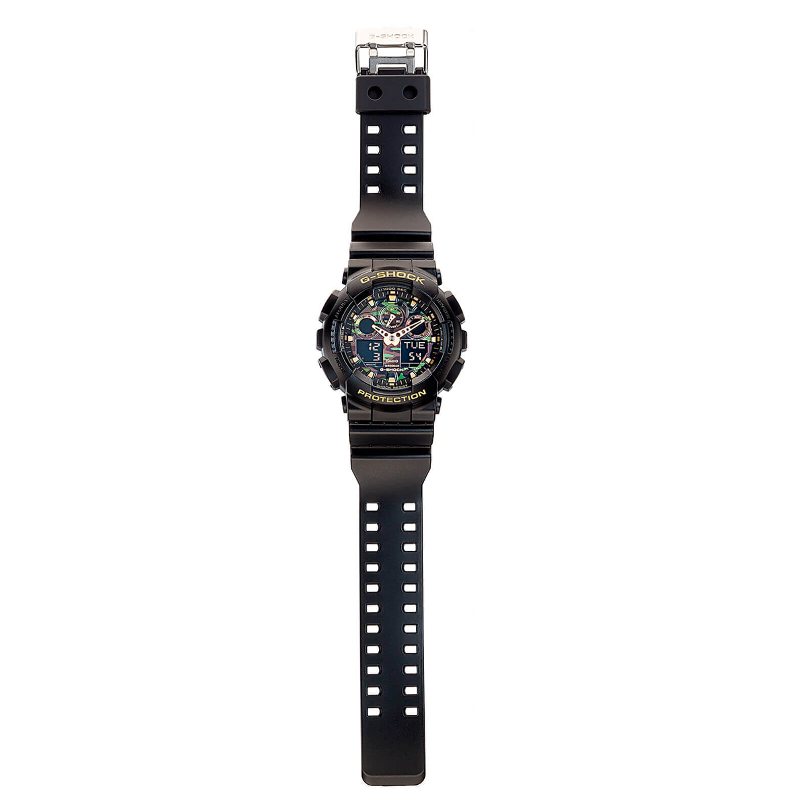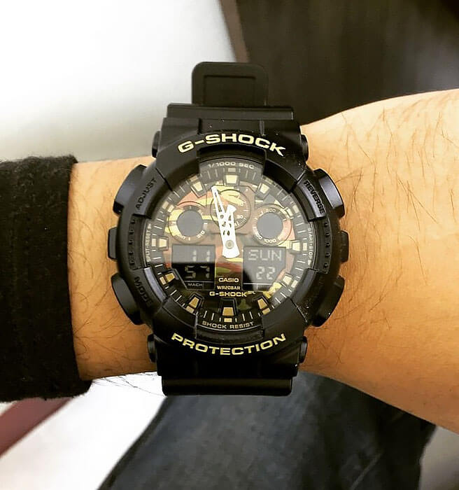 Привлекательно выглядит камуфляжный циферблат с перфорированными стрелками. Узнаваемая модель "Three-eye" выполнена из полимерного пластика, такой материал высоко ценится благодаря повышенной устойчивости к ударам, повреждениям, вибрации, падению с высоты. Кварцевый механизм японского производства с точностью хода +/- 15 секунд в месяц. Батарейка рассчитана на 2 года работы. Противоударный корпусУдаропрочный корпусМеханизм заключён в корпус, выполненный из современных материалов, устойчивых к ударам, механическим повреждениям и падению с высоты: инновационный пластик, карбон, нержавеющая сталь, титан.. Минеральное стекло. Устойчивость к влиянию магнитного поля. Водонепроницаемость 200 метров. Будильник с возможностью повтора, расчёт средней скорости пройденного маршрута, таймер, секундомер, хронографХронографФункция позволяет измерять отрезки времени с особой точностью: часы, минуты, секунды. Верным признаком хронографа является наличие на циферблате 3 дополнительных окошек-счётчиков., автоматический календарь, мировое времяМировое время Полезное часовое усложнение, отображающее время в основных городах и известных областях по всему миру, оно связано с часовыми поясами, удобно для путешественников и бизнесменов. . Габариты: 55 x 51,2 x 16,9 мм.