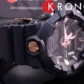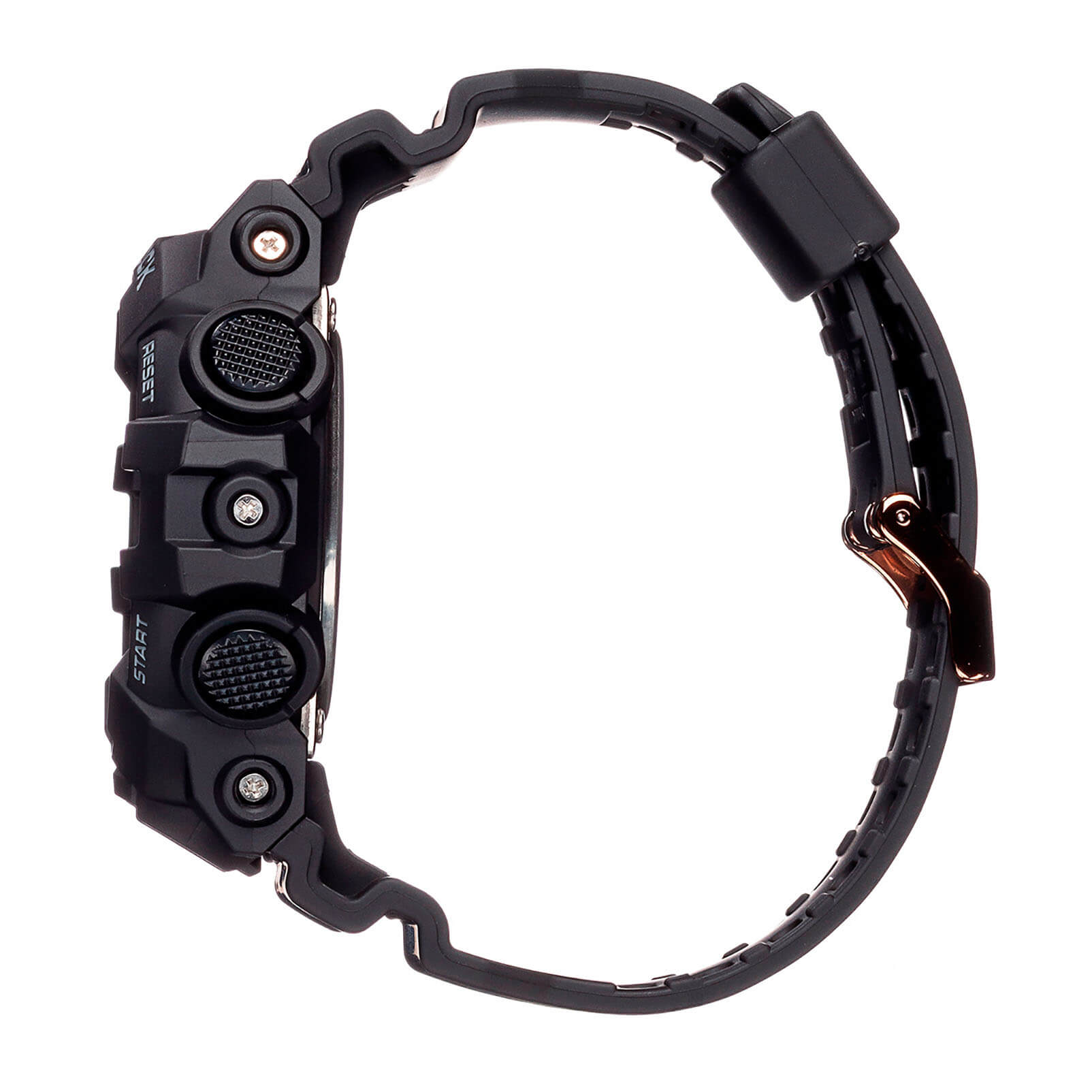 Стильный аксессуар чёрного цвета имеет привлекательные акценты в цвете розового золота, что смягчает его брутальный вид. Часы с крупными стрелками и метками обеспечивают идеальную читаемость показателей времени, кнопка подсветки для удобства вынесена в нижнюю часть ударопрочного корпусаУдаропрочный корпусМеханизм заключён в корпус, выполненный из современных материалов, устойчивых к ударам, механическим повреждениям и падению с высоты: инновационный пластик, карбон, нержавеющая сталь, титан.. Он, как и ремешок, выполнен из полимерного материала, выдерживающим удары и падения. Японский кварцевый механизм получает питание от батарейки, отличающейся повышенным сроком службы до 5 лет. Закаленное минеральное стекло. Яркая светодиодная подсветкаСветодиодная подсветкаСветодиодная или LED-подсветка обеспечивает появление яркого холодного свечения за счёт LED-элементов - маленьких лампочек. Они потребляют минимальное количество энергии, чаще всего можно встретить 1 светодиод, в нижней части циферблата.. Водозащита 200 метров. Функция перемещения стрелок для быстрого доступа к данным малых счётчиков. Таймер обратного отсчёта, UTCUTCВсемирное кординационное время, не имеющее привязки к географическому положению Гринвича, основывается на атомном отсчёте времени. Регулировка времени осуществляется более точно, чем устаревшее GMT.
