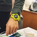 Стильный аксессуар в чёрно-жёлтом исполнении будет ярким дополнением к образу. Часы отличаются пластиковым противоударным корпусомУдаропрочный корпусМеханизм заключён в корпус, выполненный из современных материалов, устойчивых к ударам, механическим повреждениям и падению с высоты: инновационный пластик, карбон, нержавеющая сталь, титан., устойчивым к повреждениям, вибрации, падению с высоты. Они сохраняют водонепроницаемость при давлении 20 бар. Среди часовых усложнений: таймер, секундомер, BluetoothBluetoothСовременная технология, позволяющая синхронизировать часы с телефоном и переносить данные. Часы с Bluetooth расширяют возможности вашего смартфона и делают его использование ещё более удобным., автоматический календарь, мировое времяМировое время Полезное часовое усложнение, отображающее время в основных городах и известных областях по всему миру, оно связано с часовыми поясами, удобно для путешественников и бизнесменов. , функция мирового времениМировое время Полезное часовое усложнение, отображающее время в основных городах и известных областях по всему миру, оно связано с часовыми поясами, удобно для путешественников и бизнесменов. . Двойная подсветка, светодиоднаяСветодиодная подсветкаСветодиодная или LED-подсветка обеспечивает появление яркого холодного свечения за счёт LED-элементов - маленьких лампочек. Они потребляют минимальное количество энергии, чаще всего можно встретить 1 светодиод, в нижней части циферблата. и люминесцентнаяЛюминесцентное покрытиеПозволяет считывать показания времени в темноте. Производители наносят на стрелки, часовые индексы, безель или поверхность циферблата светонакопительный состав, дающий холодное свечение.. Минеральное стекло устойчиво к царапинам. Габариты: 54,1 x 48,6 x 15,5 мм.
