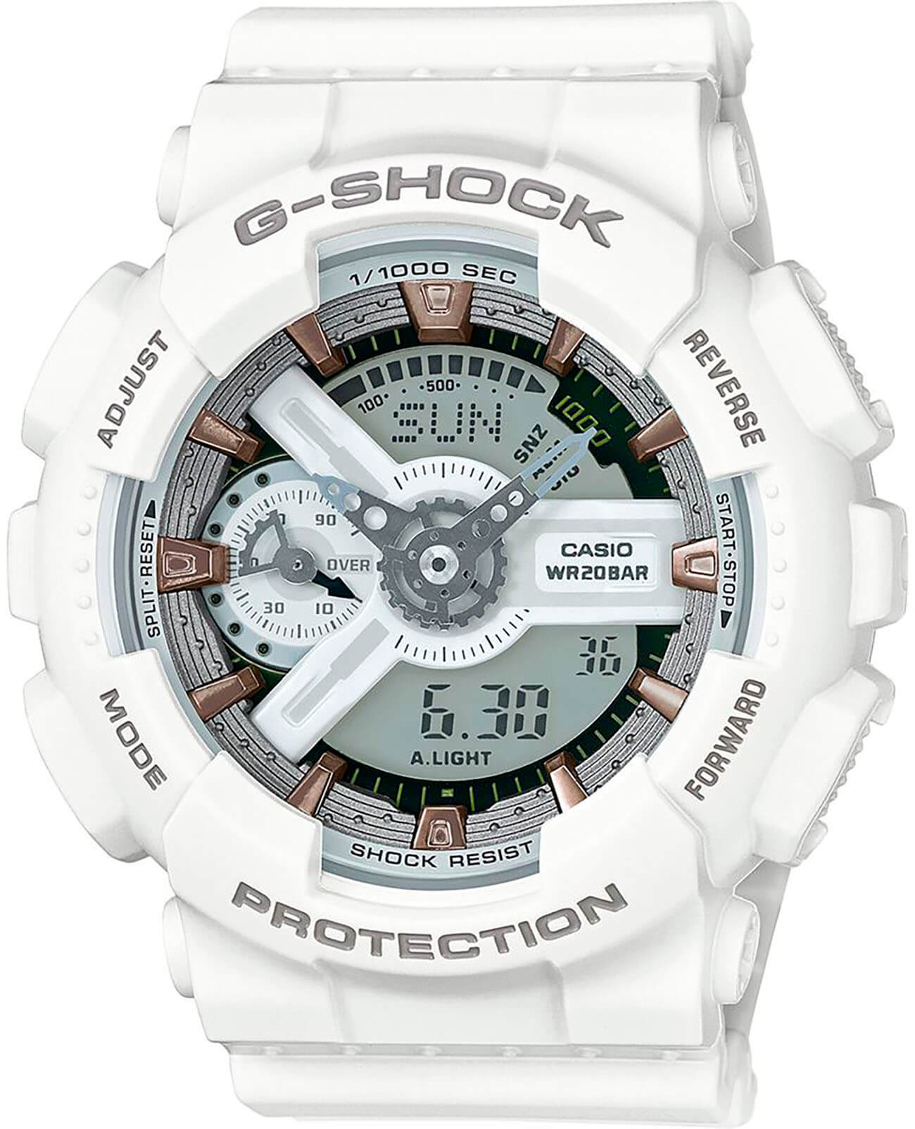 Белоснежная расцветка великолепно гармонирует с контрастными элементами циферблата. Несмотря на внушительный вес, модель отличается лёгким весом и комфортно сидит на запястье. Наручные часы обладают противоударным корпусомУдаропрочный корпусМеханизм заключён в корпус, выполненный из современных материалов, устойчивых к ударам, механическим повреждениям и падению с высоты: инновационный пластик, карбон, нержавеющая сталь, титан., который стойко переносит удары и падения с высоты. Он надёжно защищает японский кварцевый механизм, благодаря которому часы показывают время с абсолютной точностью. Батарейка рассчитана на 3 года работы. Автоматическая светодиодная подсветкаСветодиодная подсветкаСветодиодная или LED-подсветка обеспечивает появление яркого холодного свечения за счёт LED-элементов - маленьких лампочек. Они потребляют минимальное количество энергии, чаще всего можно встретить 1 светодиод, в нижней части циферблата. циферблата. Минеральное стекло. Сохранение водонепроницаемости до 20 бар. Функции: мировое времяМировое время Полезное часовое усложнение, отображающее время в основных городах и известных областях по всему миру, оно связано с часовыми поясами, удобно для путешественников и бизнесменов. , таймер обратного отсчёта, хронографХронографФункция позволяет измерять отрезки времени с особой точностью: часы, минуты, секунды. Верным признаком хронографа является наличие на циферблате 3 дополнительных окошек-счётчиков., будильник, автоматический календарь, UTCUTCВсемирное кординационное время, не имеющее привязки к географическому положению Гринвича, основывается на атомном отсчёте времени. Регулировка времени осуществляется более точно, чем устаревшее GMT.