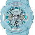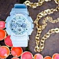 Японские женские часы GMA-S120DP-2AER из коллекции G-Shock представлены в спортивном облачении, но их пастельно-голубой оттенок позволяет продемонстрировать изысканную натуру.