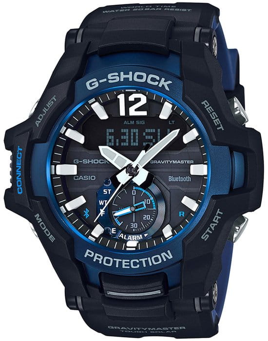 Наручные часы являются представителем линейки Gravitymaster, дисплей чем-то напоминает кабину пассажирского самолёта. Особенностью аксессуара стал цифровой дисплей с самым высоким разрешением среди G-Shock, что появилось за счёт внедрения технологии STN. Это позволило добиться широкоугольного обзора и улучшить читаемость циферблата. Также интерес привлекает модифицированный таймер, где можно установить число, месяц или год, планируемому событию для удобства можно дать название. Противоударный корпусУдаропрочный корпусМеханизм заключён в корпус, выполненный из современных материалов, устойчивых к ударам, механическим повреждениям и падению с высоты: инновационный пластик, карбон, нержавеющая сталь, титан. выполнен из полимерного материала, японский кварцевый механизм с точностью хода +/- 15 секунд в месяц находится под надёжной защитой. безельБезельВнешний ободок, закрепляющий стекло. В спортивных часах так называется поворотное кольцо с делениями на циферблате, выполняет роль таймера – замеряет отрезки времени на шкале. Неподвижный безель – элемент декора. Однонаправленно вращающийся безель на дайверских часах позволяет фиксировать моменты погружения и выныривания на поверхность. из стали 316L c IP-покрытиемIP-покрытиеМетод ионного напыления. Демонстрирует повышенную устойчивость к истиранию, окислению и химическим веществам. Под воздействием высокого давления и температуры около 1500°C молекулы металла надёжно соединяются с частицами корпуса часов.. Технология . Индикатор заряда аккумулятора. Закаленное минеральное стекло. Синхронизация со смартфоном Bluetooth 4.0BluetoothСовременная технология, позволяющая синхронизировать часы с телефоном и переносить данные. Часы с Bluetooth расширяют возможности вашего смартфона и делают его использование ещё более удобным.. Водозащита 20 бар. СветодиоднаяСветодиодная подсветкаСветодиодная или LED-подсветка обеспечивает появление яркого холодного свечения за счёт LED-элементов - маленьких лампочек. Они потребляют минимальное количество энергии, чаще всего можно встретить 1 светодиод, в нижней части циферблата. и люминесцентнаяЛюминесцентное покрытиеПозволяет считывать показания времени в темноте. Производители наносят на стрелки, часовые индексы, безель или поверхность циферблата светонакопительный состав, дающий холодное свечение. подсветка. Возможности: поиск телефона, секундомер, будильник, хронографХронографФункция позволяет измерять отрезки времени с особой точностью: часы, минуты, секунды. Верным признаком хронографа является наличие на циферблате 3 дополнительных окошек-счётчиков., автоматический календарь до 2099 года, мировое времяМировое время Полезное часовое усложнение, отображающее время в основных городах и известных областях по всему миру, оно связано с часовыми поясами, удобно для путешественников и бизнесменов. , UTCUTCВсемирное кординационное время, не имеющее привязки к географическому положению Гринвича, основывается на атомном отсчёте времени. Регулировка времени осуществляется более точно, чем устаревшее GMT.