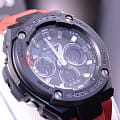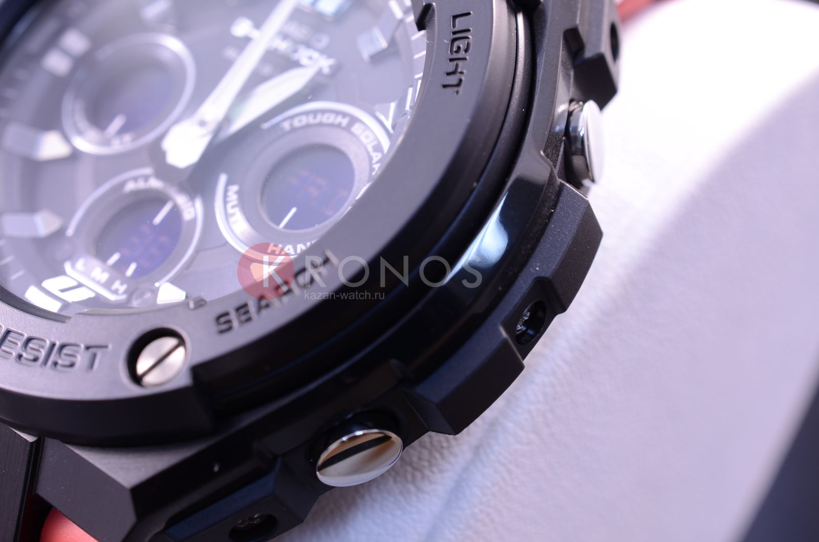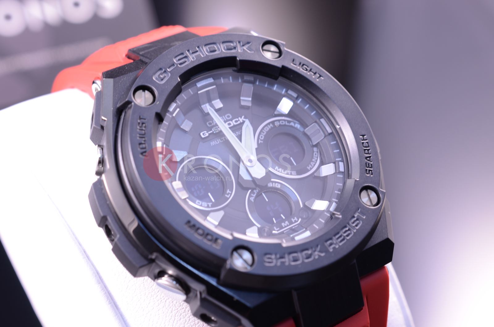 Брендовая модель серии G-Steel представлена в оригинальном исполнении, дизайнеры акцентировали внимание на внушительном безелеБезельВнешний ободок, закрепляющий стекло. В спортивных часах так называется поворотное кольцо с делениями на циферблате, выполняет роль таймера – замеряет отрезки времени на шкале. Неподвижный безель – элемент декора. Однонаправленно вращающийся безель на дайверских часах позволяет фиксировать моменты погружения и выныривания на поверхность. с IP-покрытиемIP-покрытиеМетод ионного напыления. Демонстрирует повышенную устойчивость к истиранию, окислению и химическим веществам. Под воздействием высокого давления и температуры около 1500°C молекулы металла надёжно соединяются с частицами корпуса часов.. Стильным дополнением стал красный каучуковый ремешок, обеспечивающий комфортное ношение. Это часы на солнечной батарее , позволяющие забыть о необходимости завода. Люминесцентная подсветкаЛюминесцентное покрытиеПозволяет считывать показания времени в темноте. Производители наносят на стрелки, часовые индексы, безель или поверхность циферблата светонакопительный состав, дающий холодное свечение. стрелок, яркая светодиодная подсветкаСветодиодная подсветкаСветодиодная или LED-подсветка обеспечивает появление яркого холодного свечения за счёт LED-элементов - маленьких лампочек. Они потребляют минимальное количество энергии, чаще всего можно встретить 1 светодиод, в нижней части циферблата. дисплея. Ударопрочный корпусУдаропрочный корпусМеханизм заключён в корпус, выполненный из современных материалов, устойчивых к ударам, механическим повреждениям и падению с высоты: инновационный пластик, карбон, нержавеющая сталь, титан. из пластика и хирургической стали 316L. Водостойкость 20 бар. Таймер, секундомер, будильник, мировое времяМировое время Полезное часовое усложнение, отображающее время в основных городах и известных областях по всему миру, оно связано с часовыми поясами, удобно для путешественников и бизнесменов. , автоматический календарь, приём радиосигнала для корректировки времени, хронографХронографФункция позволяет измерять отрезки времени с особой точностью: часы, минуты, секунды. Верным признаком хронографа является наличие на циферблате 3 дополнительных окошек-счётчиков.. Габариты: 55,9 x 49,3 x 15,3 мм.
