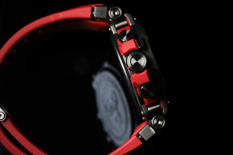 Компактный циферблат с узором в виде ромбиков стал идеальным решением для массивного стального безеляБезельВнешний ободок, закрепляющий стекло. В спортивных часах так называется поворотное кольцо с делениями на циферблате, выполняет роль таймера – замеряет отрезки времени на шкале. Неподвижный безель – элемент декора. Однонаправленно вращающийся безель на дайверских часах позволяет фиксировать моменты погружения и выныривания на поверхность.. Наручные часы MTG-B1000 выдерживают любые нагрузки благодаря особой конструкции. Ударопрочный корпусУдаропрочный корпусМеханизм заключён в корпус, выполненный из современных материалов, устойчивых к ударам, механическим повреждениям и падению с высоты: инновационный пластик, карбон, нержавеющая сталь, титан. сделан из нержавеющей стали и полимерного материала, дополнительное усиление происходит за счёт карбоновых волокон и геля Alpha Gel®, призванного защищать от негативного воздействия вибрации и температурных перепадов. Модель обладает технологией , заряжаясь от солнечного света. Индикатор состояния аккумулятора. Ионное IP-покрытиеIP-покрытиеМетод ионного напыления. Демонстрирует повышенную устойчивость к истиранию, окислению и химическим веществам. Под воздействием высокого давления и температуры около 1500°C молекулы металла надёжно соединяются с частицами корпуса часов.. Сферическое сапфировое стекло с антибликовой обработкой. Коррекция текущего времени радиосигналом. Bluetooth-синхронизация со смартфономBluetoothСовременная технология, позволяющая синхронизировать часы с телефоном и переносить данные. Часы с Bluetooth расширяют возможности вашего смартфона и делают его использование ещё более удобным.. Водонепроницаемость 20 бар. ЛюминесцентнаяЛюминесцентное покрытиеПозволяет считывать показания времени в темноте. Производители наносят на стрелки, часовые индексы, безель или поверхность циферблата светонакопительный состав, дающий холодное свечение. и светодиодная подсветкаСветодиодная подсветкаСветодиодная или LED-подсветка обеспечивает появление яркого холодного свечения за счёт LED-элементов - маленьких лампочек. Они потребляют минимальное количество энергии, чаще всего можно встретить 1 светодиод, в нижней части циферблата.. Красный полимерный ремешок. Возможности: таймер, будильник, мировое времяМировое время Полезное часовое усложнение, отображающее время в основных городах и известных областях по всему миру, оно связано с часовыми поясами, удобно для путешественников и бизнесменов. , секундомер, календарь, UTCUTCВсемирное кординационное время, не имеющее привязки к географическому положению Гринвича, основывается на атомном отсчёте времени. Регулировка времени осуществляется более точно, чем устаревшее GMT.