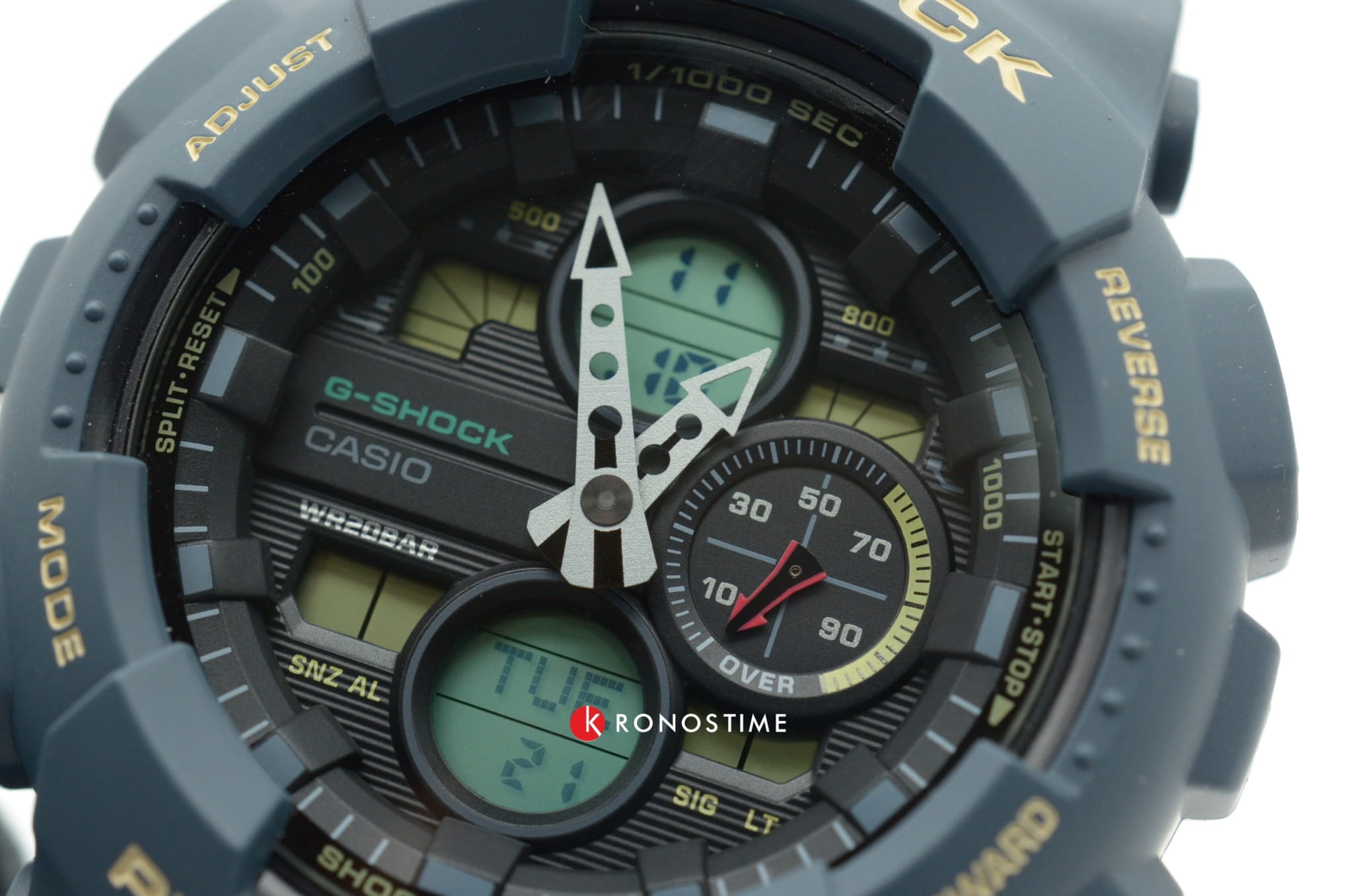 Форма ударопрочного корпусаУдаропрочный корпусМеханизм заключён в корпус, выполненный из современных материалов, устойчивых к ударам, механическим повреждениям и падению с высоты: инновационный пластик, карбон, нержавеющая сталь, титан. унаследована от моделей линейки GA-100, в обновленном варианте предстал циферблат и оригинальные стрелки. Наручные часы в тёмно-синей расцветке и элементами песочного цвета станут прекрасным дополнением к повседневному образу, брендовая модель не имеет ни одной лишней детали. Аксессуар изготовлен из полимерного материала, благодаря его устойчивости к ударам и повреждениям часы получили максимальную надёжность. Японский кварцевый калибр с точностью хода +/- 15 секунд в месяц работает от батарейки, рассчитанной на 2 года. Автоматическая светодиодная подсветкаСветодиодная подсветкаСветодиодная или LED-подсветка обеспечивает появление яркого холодного свечения за счёт LED-элементов - маленьких лампочек. Они потребляют минимальное количество энергии, чаще всего можно встретить 1 светодиод, в нижней части циферблата.. Устойчивость к магнитным полям. Минеральное стекло. Класс водозащиты WR 200. Расчёт средней скорости пути, хронографХронографФункция позволяет измерять отрезки времени с особой точностью: часы, минуты, секунды. Верным признаком хронографа является наличие на циферблате 3 дополнительных окошек-счётчиков., автоматический календарь, секундомер, мировое времяМировое время Полезное часовое усложнение, отображающее время в основных городах и известных областях по всему миру, оно связано с часовыми поясами, удобно для путешественников и бизнесменов. , таймер, будильник. Габариты: 55 x 51,2 x 16,9 мм.