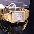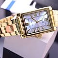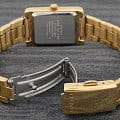 Кварцевые часы выполнены из прочных и долговечных материалов. Прямоугольный корпус аксессуара сделан из гипоаллергенной латуни. На серебристом циферблате расположены золотые арабские цифры и штрихи, которые смотрятся привлекательно и удобны в чтении. Широкий, удобный в носке браслет сделан из нержавеющей стали и имеет раскладывающуюся застежку. Прямоугольной и прочный корпус из гипоаллергенной латуни прочно закреплен к браслету и защищен минеральным стеклом. Источником питания для часов служит батарейка, срок службы которой составляет 3 года.
