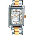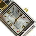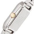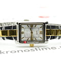 Необычный дизайн аксессуара сочетает в себе серебристый и золотой цвета. Прямоугольный, серебристый корпус сделан из прочной латуни. Минерально, стойкое к царапинам стекло прочно вставлено в корпус. Стальной, двухцветный браслет содержит в себе надежную, раскладывающуюся застежку, которая предотвращает потерю часов. На циферблате расположены отчетливые арабские цифры и штрихи. Кварцевый механизм.