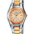 На поверхность наручных часов от Casio нанесено защитное IP-покрытиеIP-покрытиеМетод ионного напыления. Демонстрирует повышенную устойчивость к истиранию, окислению и химическим веществам. Под воздействием высокого давления и температуры около 1500°C молекулы металла надёжно соединяются с частицами корпуса часов.. Стальной корпус аксессуара сделан из нержавеющей стали. На круглом циферблате светло-золотистого цвета расположены аккуратные временные отметки в виде арабских цифр и штрихов. Двухцветный браслет сделан из нержавеющей стали. Часы надежно защищены минеральным стеклом. Вес аксессуара равен 52 граммам. Часы работают от батарейки со сроком службы в 3 года.