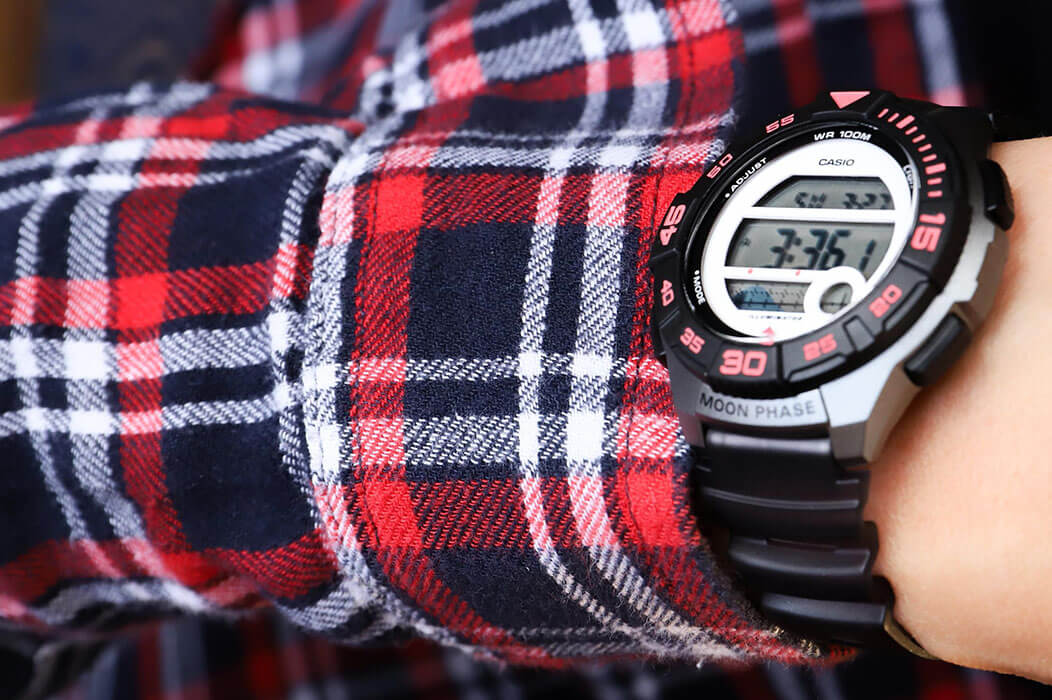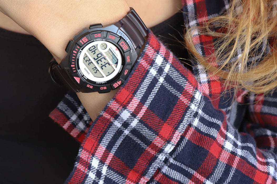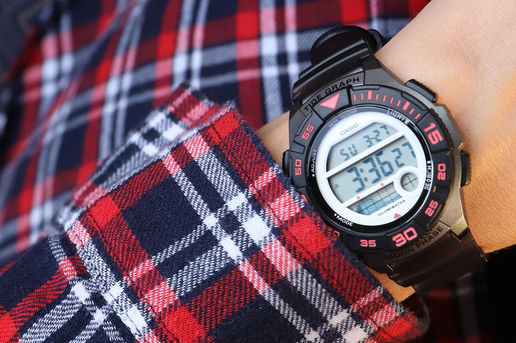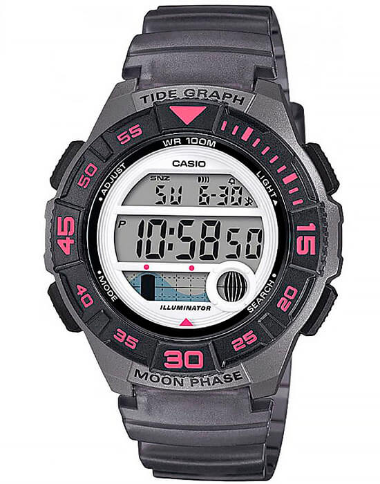 Стильные наручные часы выполнены из высококачественных полимерных материалов. Акриловое стекло надежно защищает изделие от повреждений. Электролюминесцентная подсветкаЭлектролюминесцентная подсветкаЭлектролюминесцентная панель устанавливается под ЖК-экраном часов, при нажатии кнопки электричество преобразуется в свет за счёт подачи напряжения на атомы фосфора, такой тип подсветки позволяет освещать весь циферблат. облегчает считывание данных с циферблата. Благодаря автоматическому календарю всегда будет известна актуальная дата. Встроен датчик, отображающий фазы прилива и отлива в определенном месте. Есть автоматический таймер и будильник с 3 сигналами. Прошедшее время измеряется с точностью в 1/100 секунды. Высокая водонепроницаемость, равная 10 Барам.