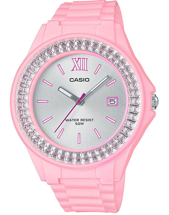 Корпус аккуратных и ярких наручных часов от Casio сделан из пластика. Яркий безельБезельВнешний ободок, закрепляющий стекло. В спортивных часах так называется поворотное кольцо с делениями на циферблате, выполняет роль таймера – замеряет отрезки времени на шкале. Неподвижный безель – элемент декора. Однонаправленно вращающийся безель на дайверских часах позволяет фиксировать моменты погружения и выныривания на поверхность. вокруг циферблата отражает падающий свет и добавляет аксессуару привлекательности. На круглом циферблате серебристого цвета расположены аккуратные римские цифры и штрихи. Благодаря кварцевому механизму отсутствует необходимость каждый раз заводить часы. Благодаря подсветке NeobriteПодсветка NeobriteИспользование светонакопительных составов на основе сульфида цинка или алюмината стронция, яркий свет можно наблюдать на протяжении 6-10 часов после «зарядки» часов около источника света. узнать информацию на циферблате легко даже в темное время суток. Водонепроницаемость составляет 50 WR.