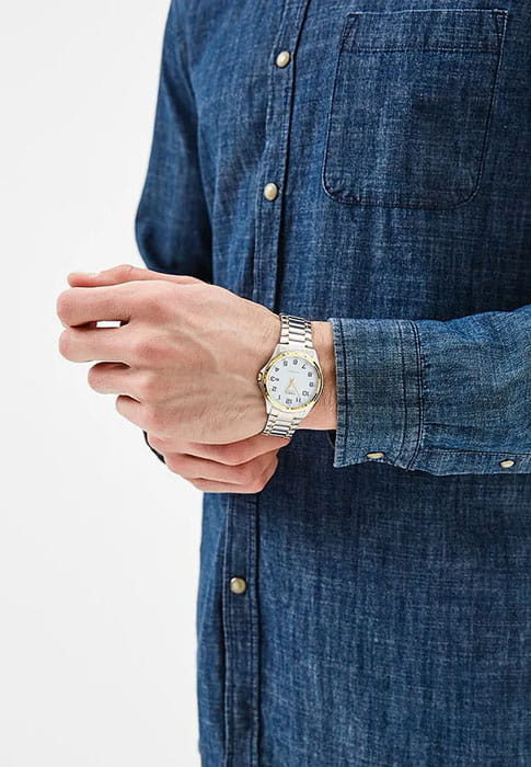 Часы станут незаменимым помощником на любой случай жизни. Сдержанный дизайн, выдержанный в классическом характере. Круглый корпус выполнен из латуни. Двухцветный стальной браслет будет прочно сидеть на запястье. Благодаря раскладывающейся застежке, потеря аксессуара сведена к минимуму. На циферблате традиционной формы расположены отчетливые цифры черного цвета. Есть гармоничный, аккуратный числовой календарь. Минеральное стекло надежно защищает часы от царапин. Аналоговый способ отображения времени. Кварцевый тип механизма.
