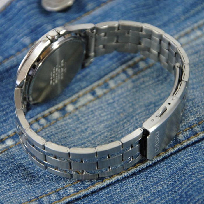 Данная модель от Casio придется по вкусу ценителям высокого качества, комфорта и стильного дизайна. Корпус выполнен из латуни. Стальной браслет прочно обхватывает запястье и закрепляется с помощью раскладывающейся застежки. Синий циферблат традиционной формы обрамляет аккуратный безельБезельВнешний ободок, закрепляющий стекло. В спортивных часах так называется поворотное кольцо с делениями на циферблате, выполняет роль таймера – замеряет отрезки времени на шкале. Неподвижный безель – элемент декора. Однонаправленно вращающийся безель на дайверских часах позволяет фиксировать моменты погружения и выныривания на поверхность.. Крупные отчетливые временные отметки выполнены в виде штрихов и арабских цифр. Подсветка NeobriteПодсветка NeobriteИспользование светонакопительных составов на основе сульфида цинка или алюмината стронция, яркий свет можно наблюдать на протяжении 6-10 часов после «зарядки» часов около источника света. обеспечивает видимость показателей в темное время суток. Тип механизма - кварцевый. Вес составляет 105 грамм.рейтинг магазина