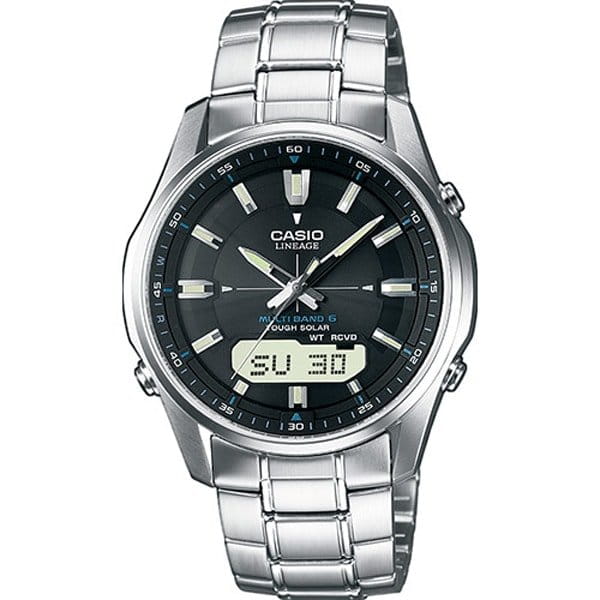 Высокотехнологичные японские наручные мужские часы. Круглый корпус и браслет часов выполнены из нержавеющей стали. Водонепроницаемость 10 ATM.  Круглый циферблат черного цвета. Часы оснащены такими функциями как секундомер, таймер обратного отсчета, будильник, мировое время, второй часовой пояс, прием радиосигнала. Сапфировое стекло не царапается.