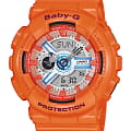 Японские женские часы-хронографХронографФункция позволяет измерять отрезки времени с особой точностью: часы, минуты, секунды. Верным признаком хронографа является наличие на циферблате 3 дополнительных окошек-счётчиков.  Casio Baby-G BA-110SN-4AER из коллекции Baby-G. Серия, которая выражает спортивность и цвет, которые являются основой бренда Baby-G. Минеральное стеклоМинеральное стеклоМинеральное стекло представляет собой искусственно выращенный минерал кварца. Такое стекло отличается особой устойчивостью к повреждениям и царапинам. Уступает по некоторым качествам сапфировому стеклу. устойчивое к появлению царапин, обладающее высокой прозрачностью. Корпус часов изготовлен из полимерного материала. Функции: автоматическая светодиодная подсветка. Ударопрочный корпусУдаропрочный корпусМеханизм заключён в корпус, выполненный из современных материалов, устойчивых к ударам, механическим повреждениям и падению с высоты: инновационный пластик, карбон, нержавеющая сталь, титан. защищает механизм от ударов и вибрации. Функция Мирового времениМировое время Полезное часовое усложнение, отображающее время в основных городах и известных областях по всему миру, оно связано с часовыми поясами, удобно для путешественников и бизнесменов. . "stopwatch" "Секундомер"} с точностью измерения 1/100 секунды и измерением до 23 часов 59 минут 59,99 cек. ТаймерТаймерОтсчитывает секунды в обратном направлении в заданном интервале времени. обратного отсчета (диапазон времени 24 часа), автоматический календарь, 12/24 отображение времени. 5 ежедневных будильниковБудильникБуди́льник — часы, в заданный момент времени подающие звуковой, световой и/или в редких случаях другой сигнал.. Функция включения/отключения звука. Класс водозащиты: 100 метров, позволит плавать без погружения. Ремешок из полимерного материала на стандартной застежке.