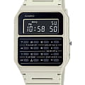 Аксессуар привлекает белым олдскульным исполнением, напоминающим о начальном успехе компании Casio. Модель серии Vintage оснащены калькулятором для различных математических операций с использованием чисел, содержащих до 8 знаков. Среди дополнительных функций: секундомер с точностью 1/100 секунды, индикация второго часового пояса, хронографХронографФункция позволяет измерять отрезки времени с особой точностью: часы, минуты, секунды. Верным признаком хронографа является наличие на циферблате 3 дополнительных окошек-счётчиков., будильник, ежечасный сигнал, вечный календарьВечный календарьКлассическое часовое усложнение, представляющее собой календарь, рассчитанный на несколько лет вперёд (стандартно – до 2099 года). Определяет текущую дату, день недели, месяц. до 2099 года. Корпус и браслет изготовлены из полимерного материала, современный пластик комфортно ощущается на запястье и устойчив к ударам. Часы работают за счёт японского кварцевого механизма, 1 батарейка рассчитана на 5 лет службы. Для защиты циферблата используется акриловое стекло. Габариты: 43,2 x 34,4 x 8,2 мм.
