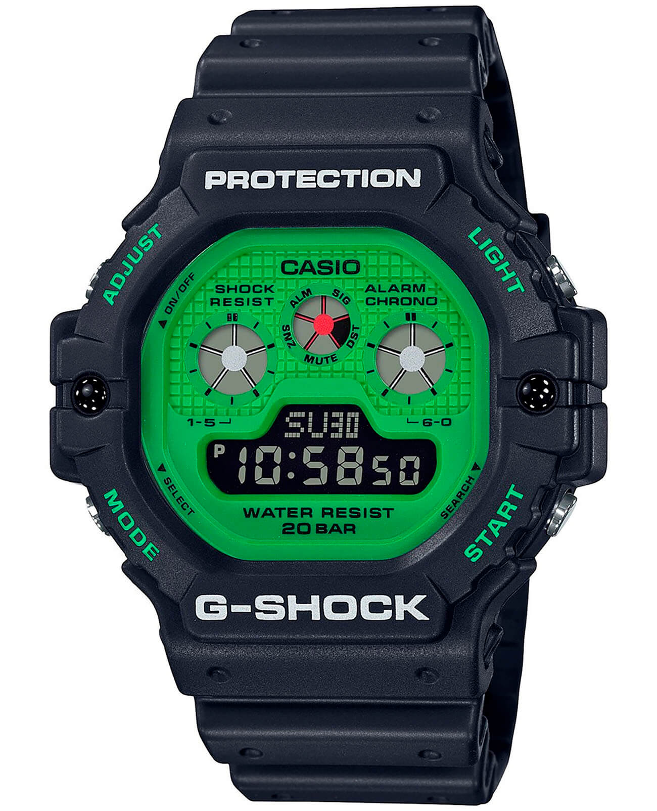 Мужские японские часы DW-5900RS-1ER из коллекции G-Shock представляют собой современную вариацию модели 1992 года, яркая чёрно-зелёная расцветка поможет создавать неповторимые образы.
